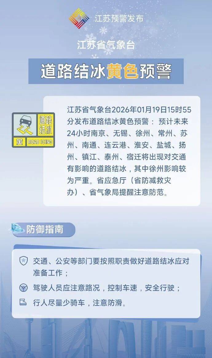 江苏省气象台最新消息,江苏正遭遇强冷空气侵袭,寒潮黄色预警、海区大风黄色预警持续生效中,今夜将迎来本轮雨雪天气的最强时段,同时道路结冰风险高,需格外警惕出行安全。