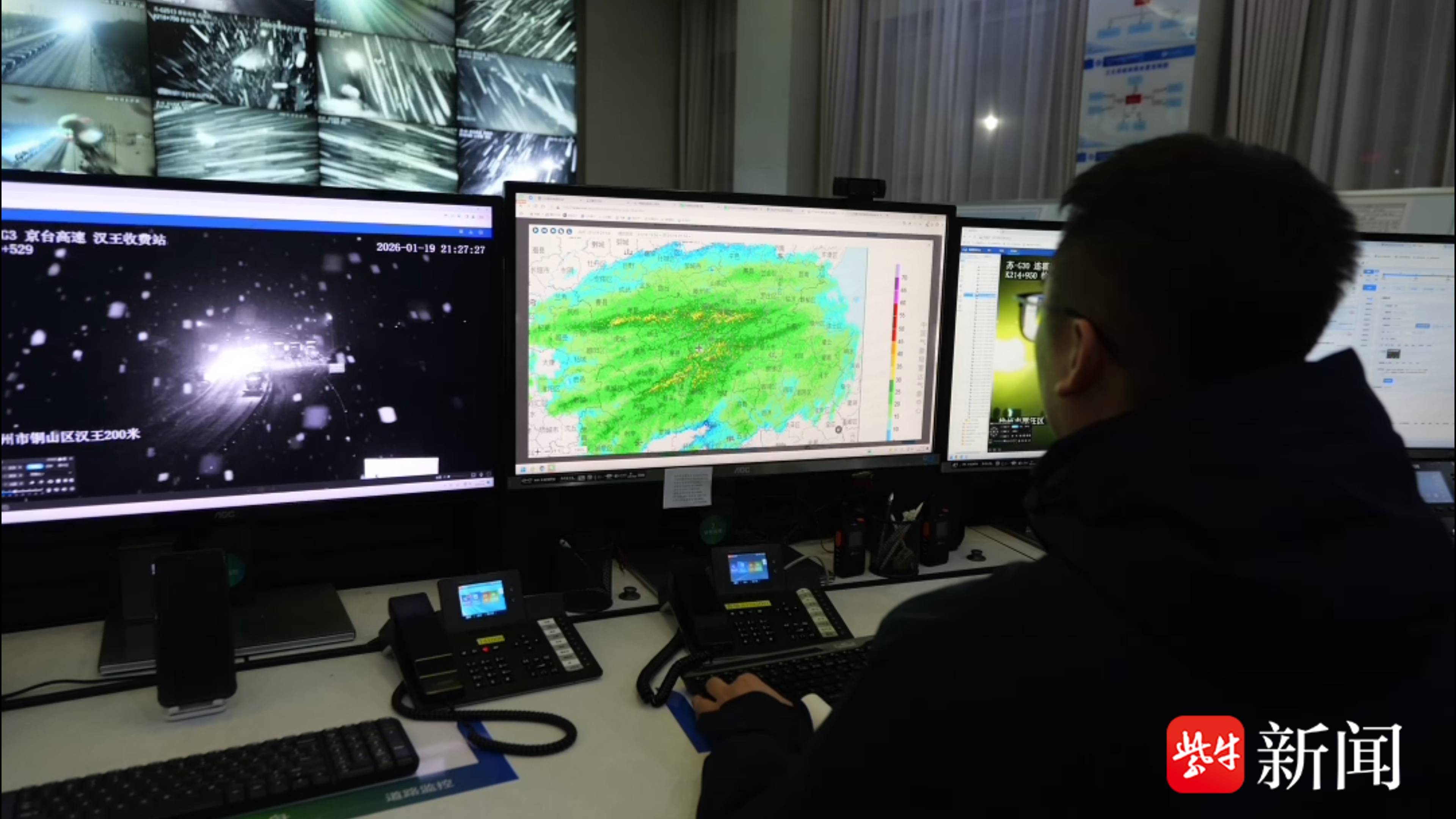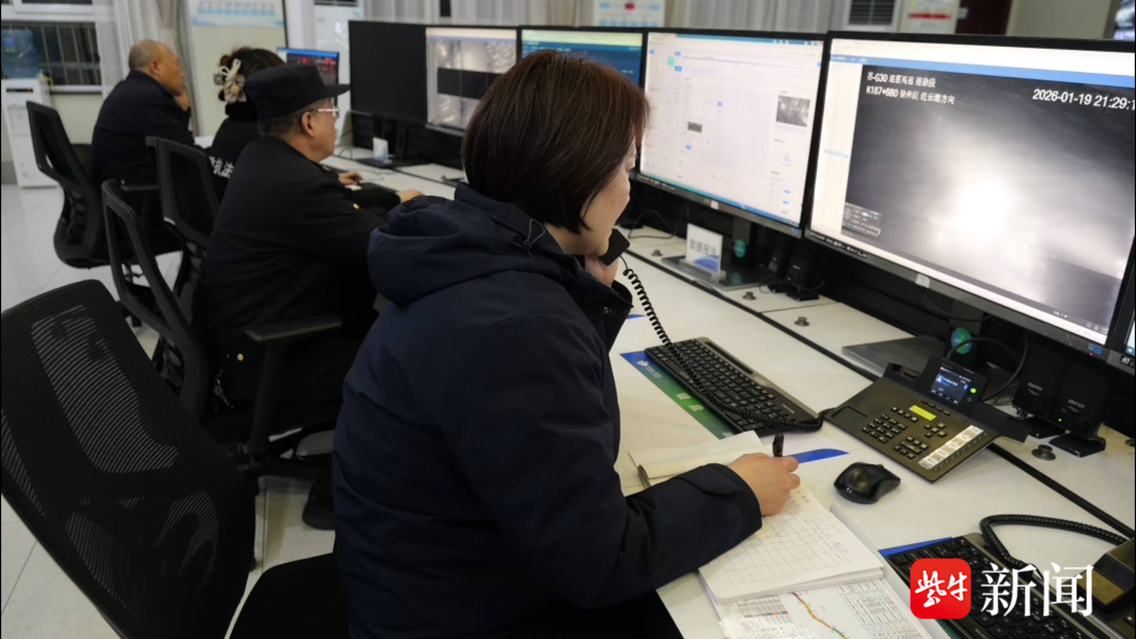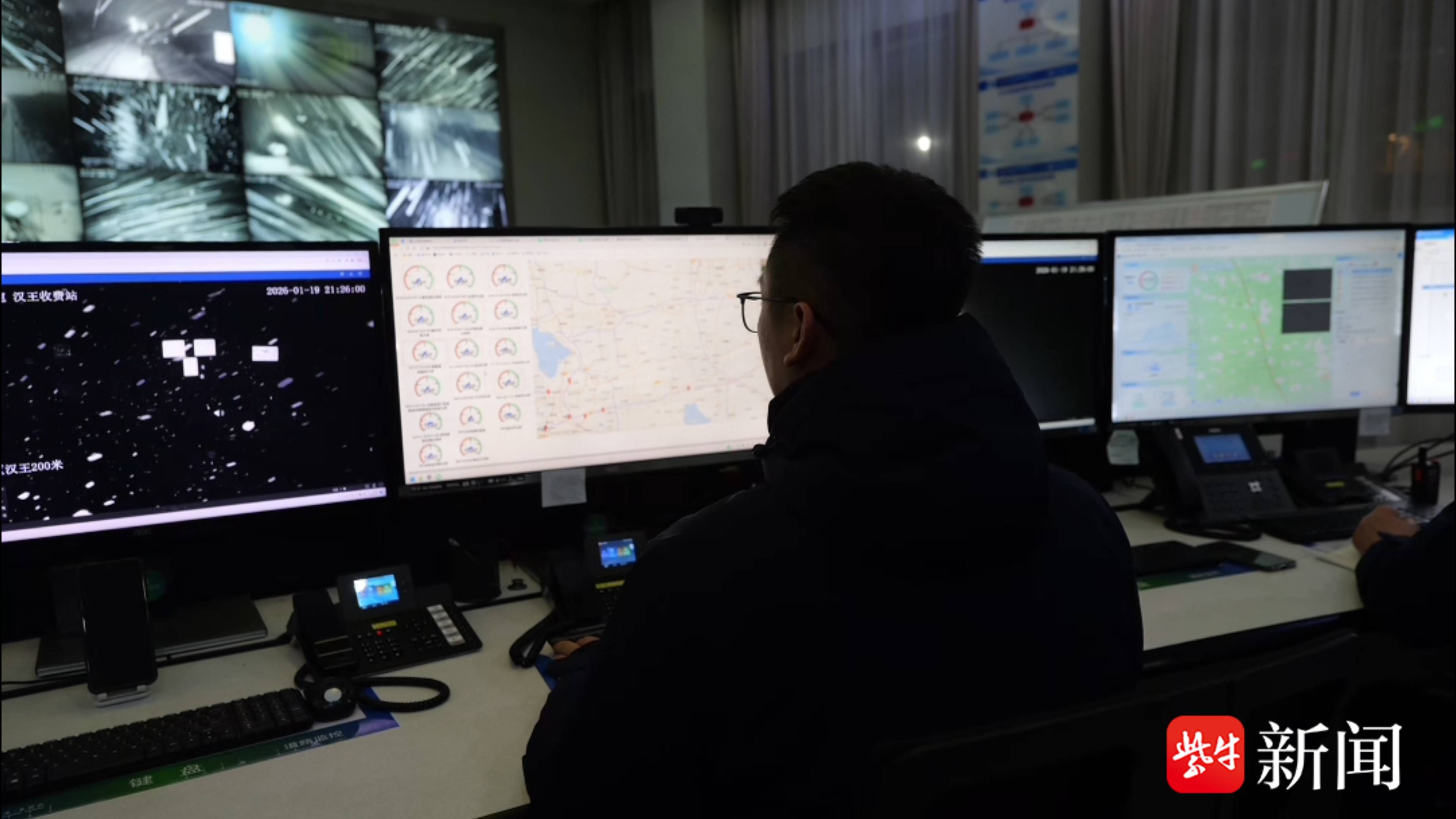 与此同时,在连徐高速公路有限公司调度指挥中心里,虽然听不到风雪声,但紧张的气氛丝毫未减。巨大的电子屏占据整面墙,分割成数十个实时监控画面,切换着各条高速的关键点位。