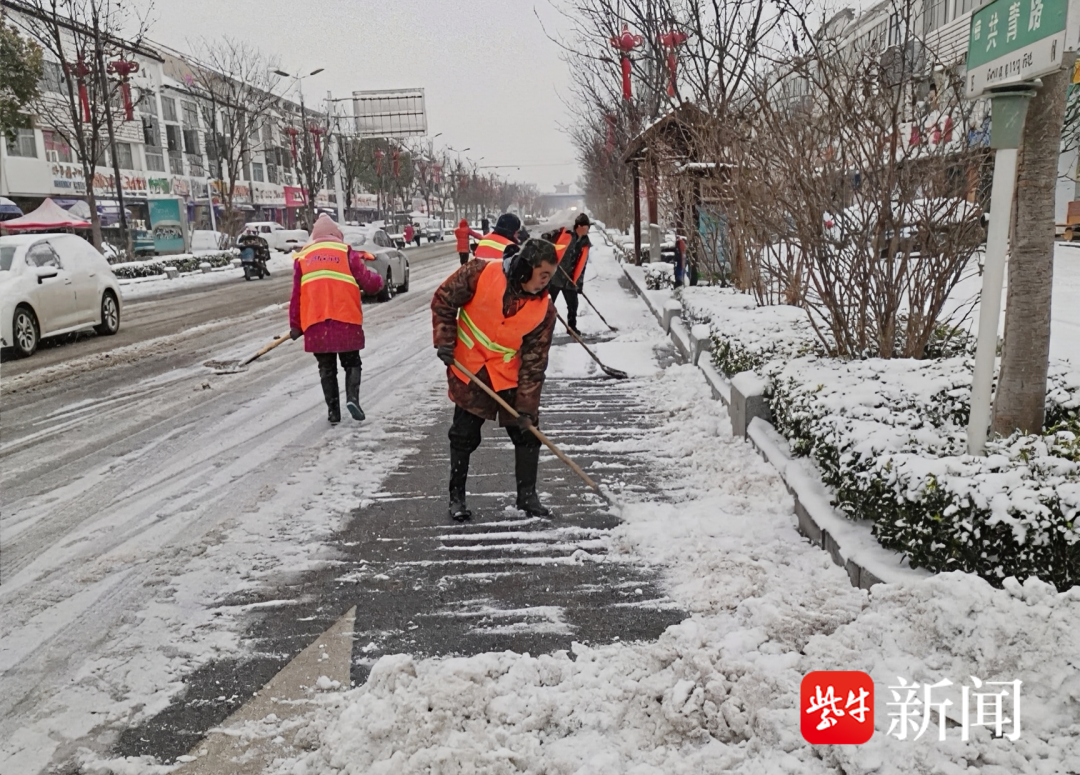 雪情即是命令,镇城管中队按预设应急预案,组织40余名环卫工人和铲雪车、撒盐车对集镇主要干道进行撒盐、积雪清理,在公厕等环卫设施处,环卫人员还铺设防滑垫、增设警示牌等,全力以赴确保群众出行安全。