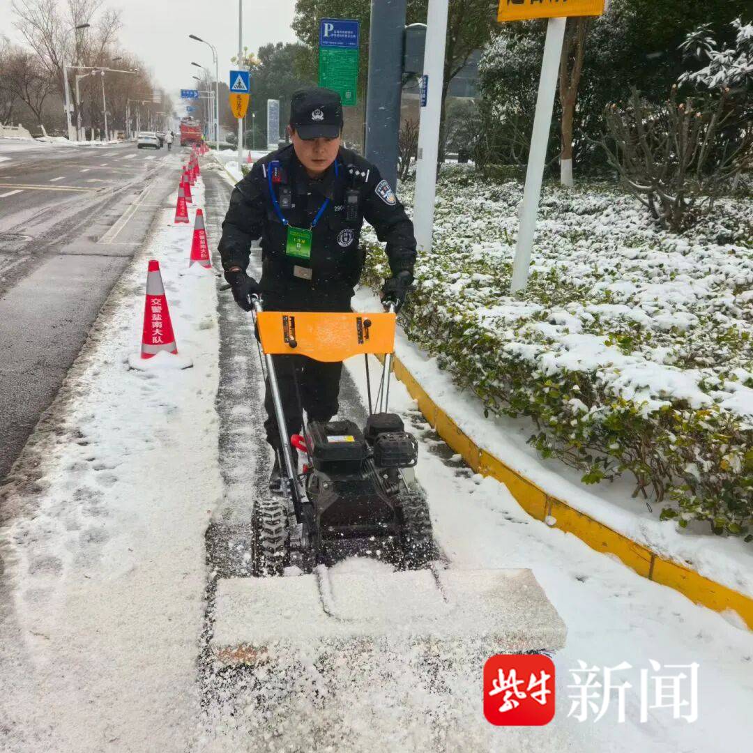降雪发生后,盐城市公安局统筹部署警力调配,交警部门聚焦城市主干道、桥梁隧道、学校周边、医院门口等重点路段,增派巡逻与疏导警力,采取定点值守与动态巡逻相结合的方式,实时监控路况信息,联合市政部门开展铲雪除冰作业,引导车辆减速慢行、有序通行。“降雪导致路面摩擦系数降低,我们通过高音喇叭提醒、现场指挥引导等方式,引导驾驶员谨慎驾驶,同时加强安全提示,确保道路通行秩序稳定。”一线执勤民警介绍。
