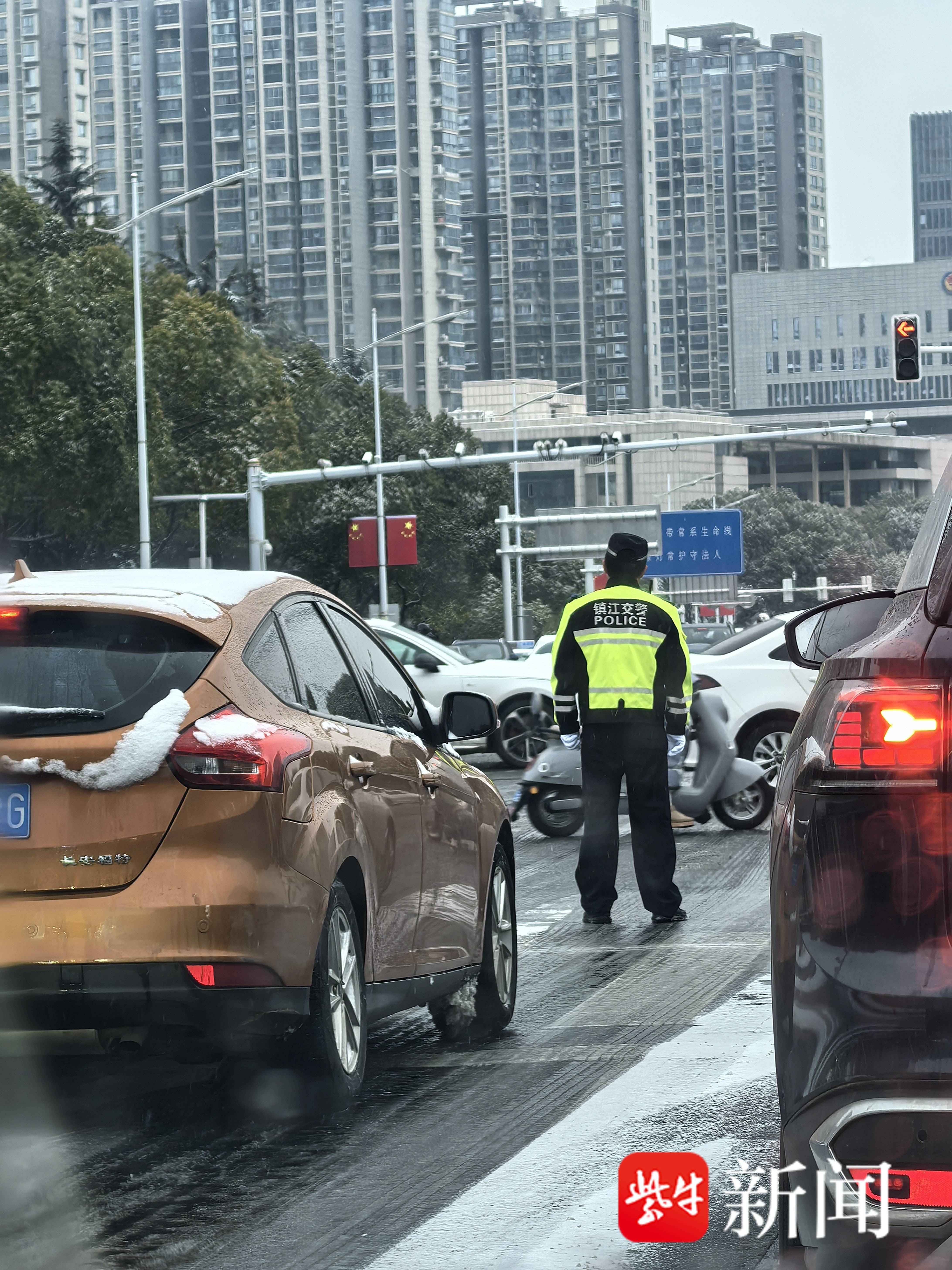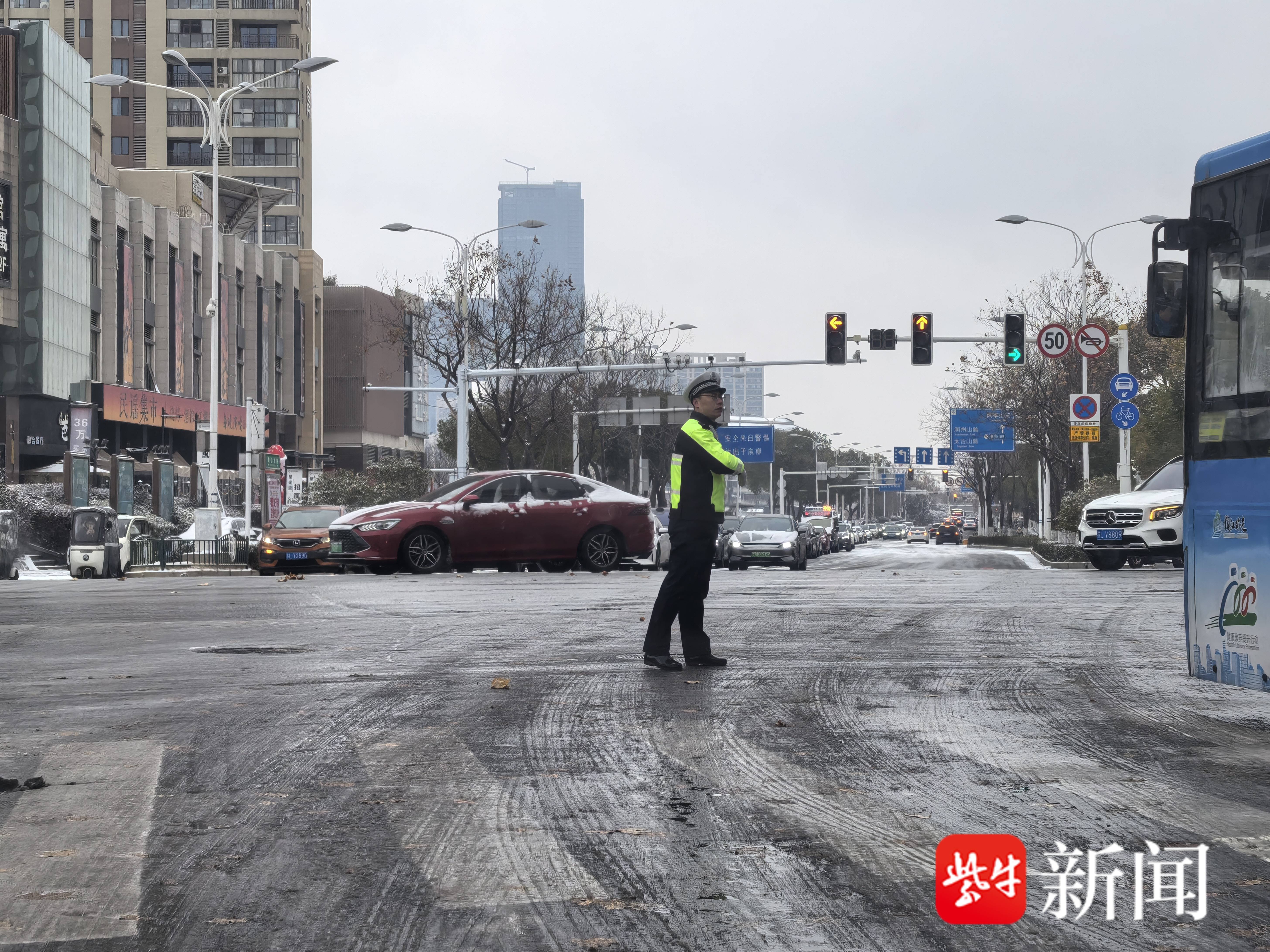 大雪中,交警维持秩序。