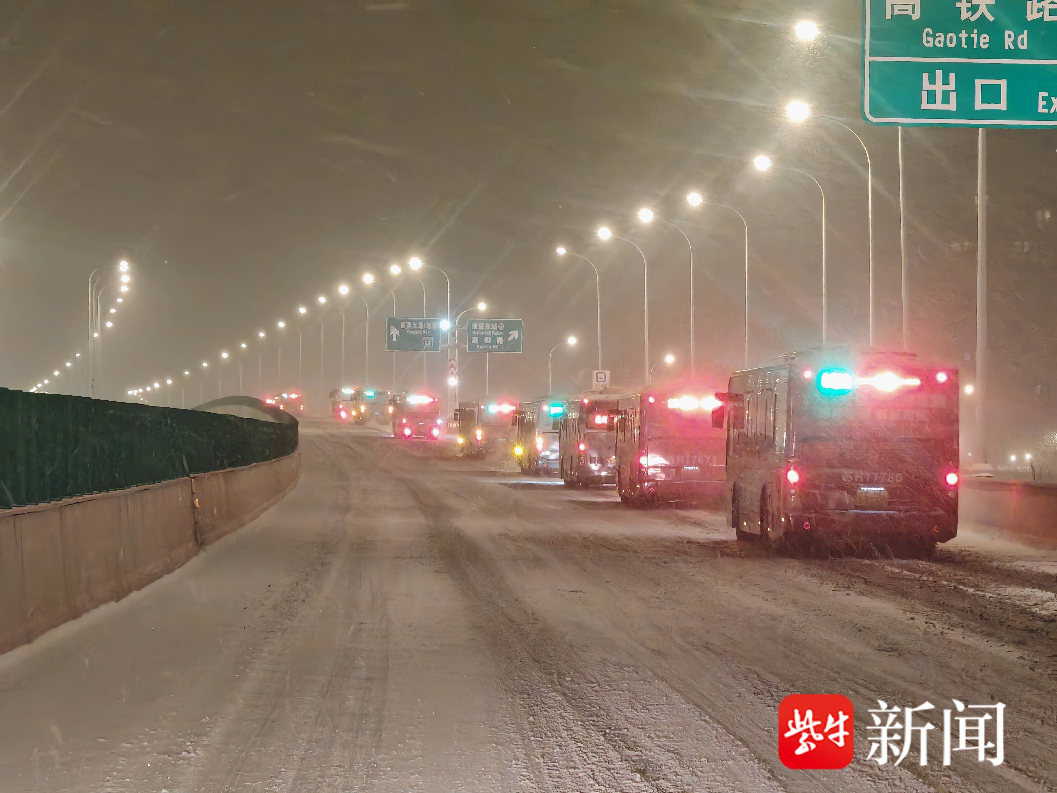 1月20日凌晨3时,夜色正浓,室外大雪纷飞,气温跌至冰点以下,寒风裹挟着雪粒呼啸而过,刺骨难耐。在淮安交警部门的统一调度指挥下,淮安公交集团组建的60辆公交车专业高架轧冰车队整装待发,车身在路灯与雪光交织下格外醒目。随着指令下达,车队在警车的引导下,整齐有序地驶入城市高架快速路,开启了夜间迎风战雪、轧道破冰作业。