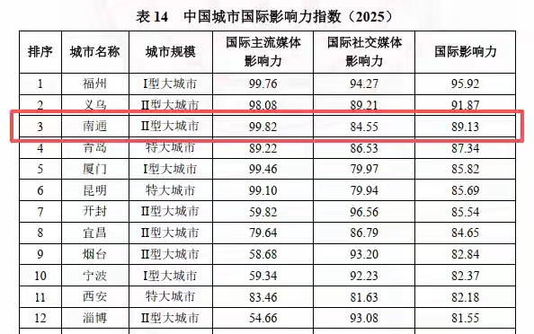 南通国际影响力位居全国第三 《中国城市国际网络形象指数报告(2025)》正式发布