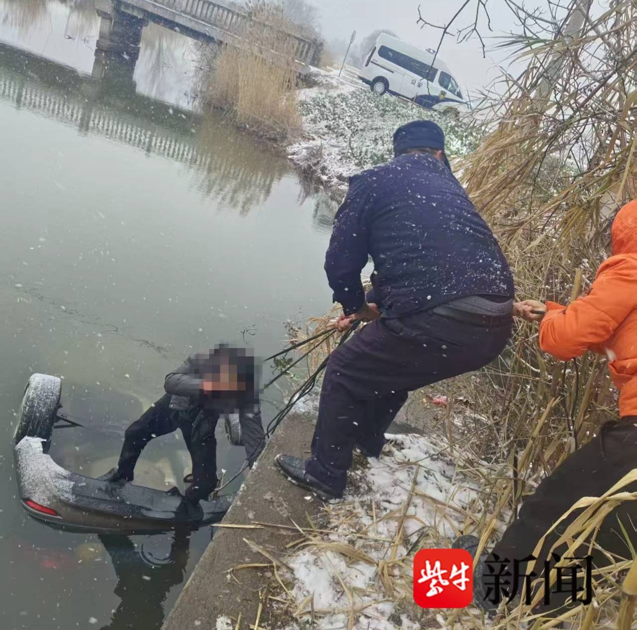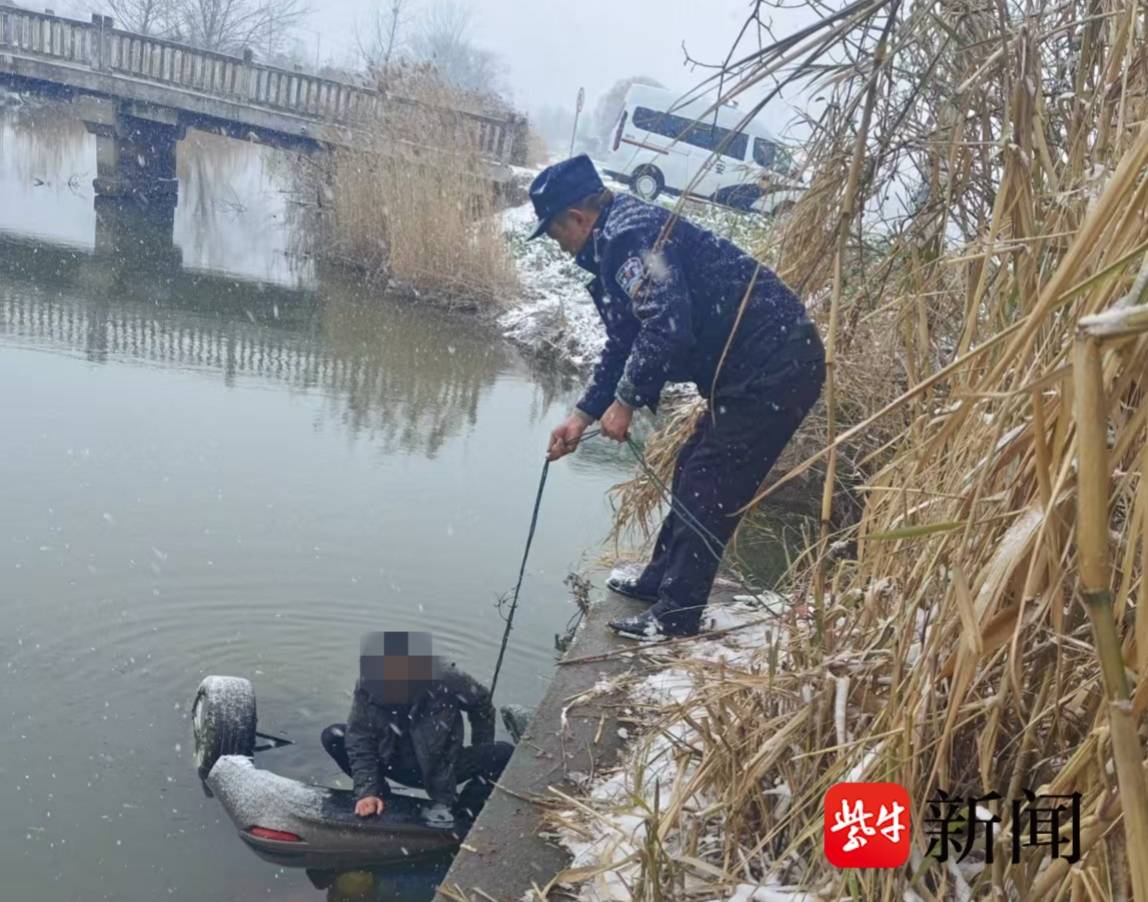 风雪救援!如皋私家车失控坠河 警民合力紧急营救被困驾驶员