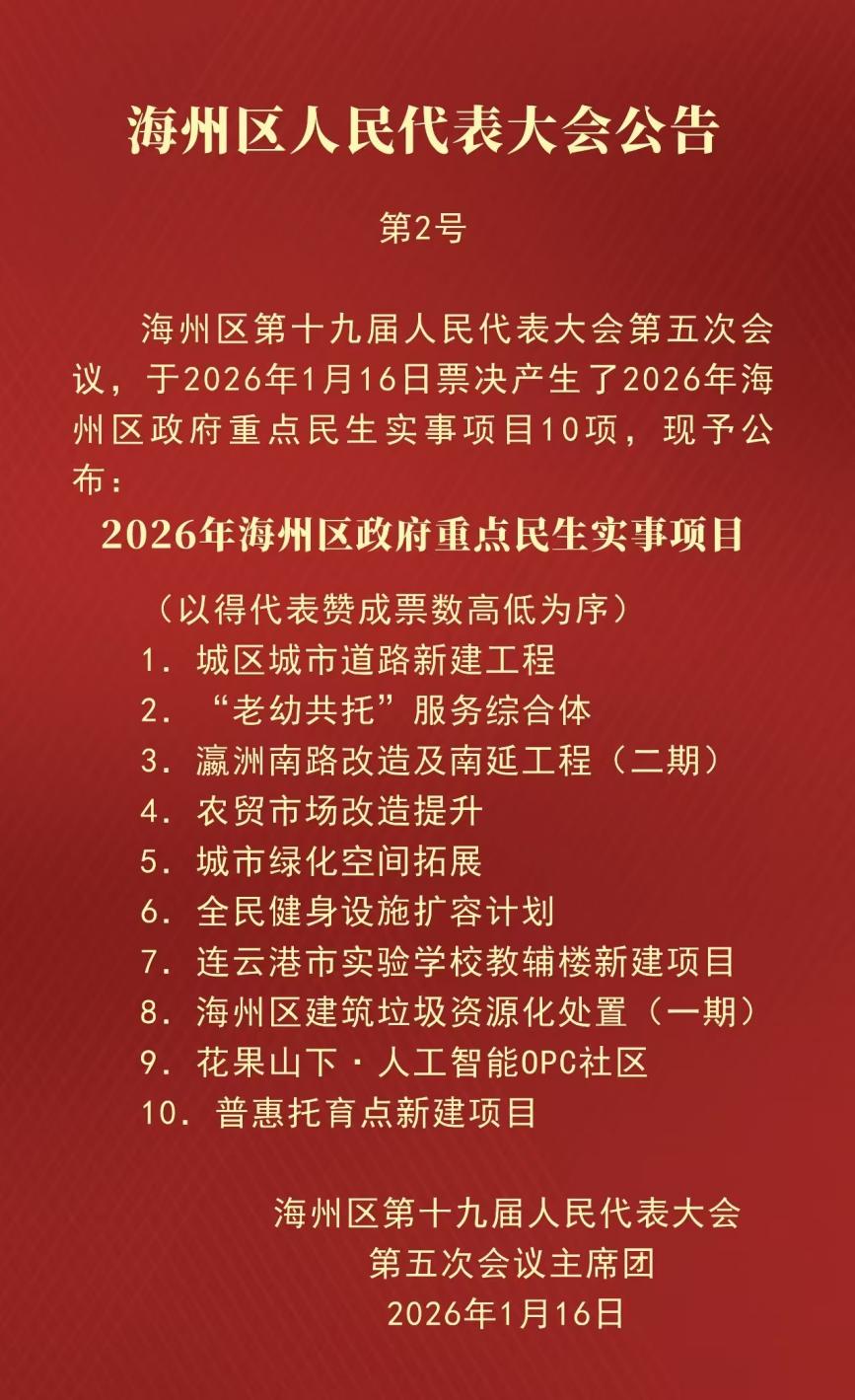 1月16日上午,连云港市海州区第十九届人民代表大会第五次会议圆满完成各项议程,举行闭幕会。会议现场正式宣布了海州区2026年政府重点民生实事项目票决结果,一批聚焦群众急难愁盼的民生项目顺利敲定,为新一年民生保障工作划定清晰蓝图。