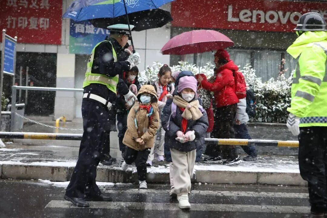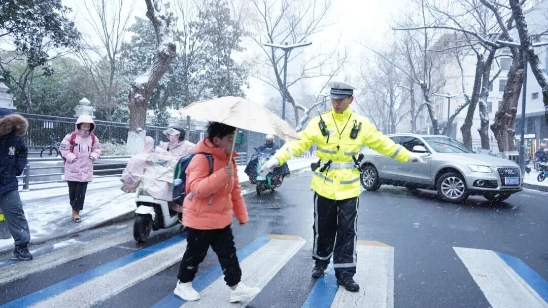 雪天里,常州公安加大“护学岗”执勤力度。雪花轻落民警肩章,也飘在孩子们的笑脸上,一句 “别急,慢慢走”,温暖了上学路。