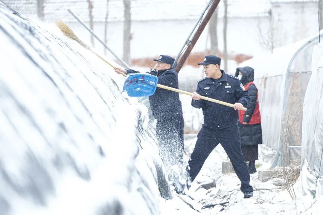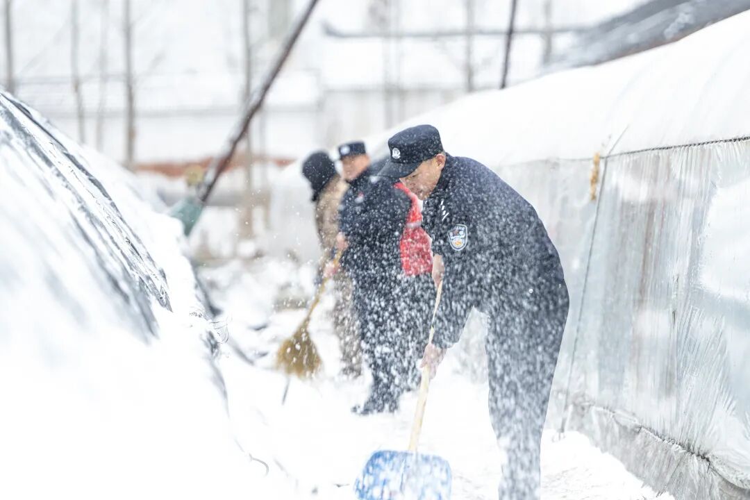 1月19日,突如其来的大雪给淮安市淮阴区丁集镇的黄瓜种植户带来严峻考验。淮安市公安局淮阴分局丁集镇派出所民警闻讯赶到现场,帮助清理蔬菜大棚积雪,用藏蓝身影守护冬日里的“绿色希望”。