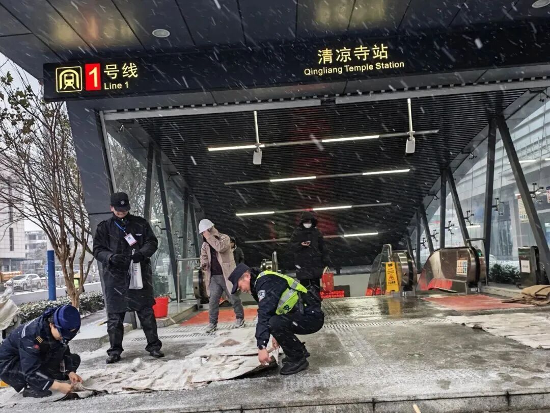 漫天飞雪席卷龙城大地,常州公安在地铁出入口增派警力维持秩序,搀扶乘客、清理积雪,最大限度保障出行安全,确保换乘安全顺畅。