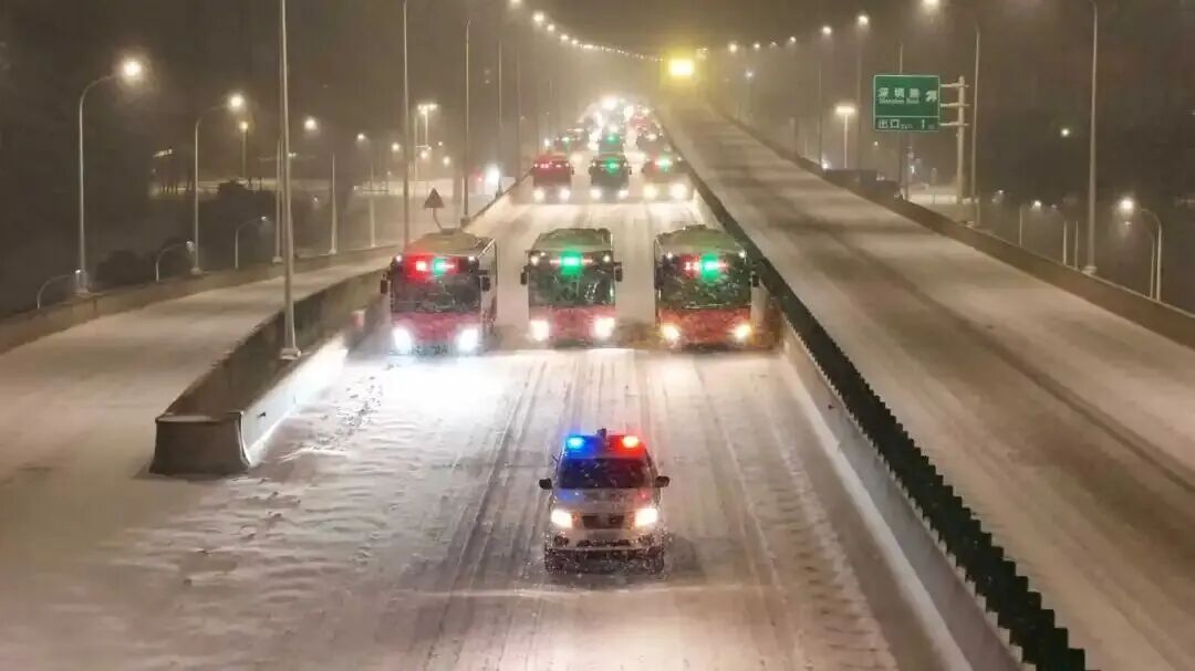 徐州公安在桥梁、坡道、匝道等重点路段,增派警力值守,通过亮灯巡逻、喇叭提示等方式,引导车辆减速慢行,全力保障通行秩序。