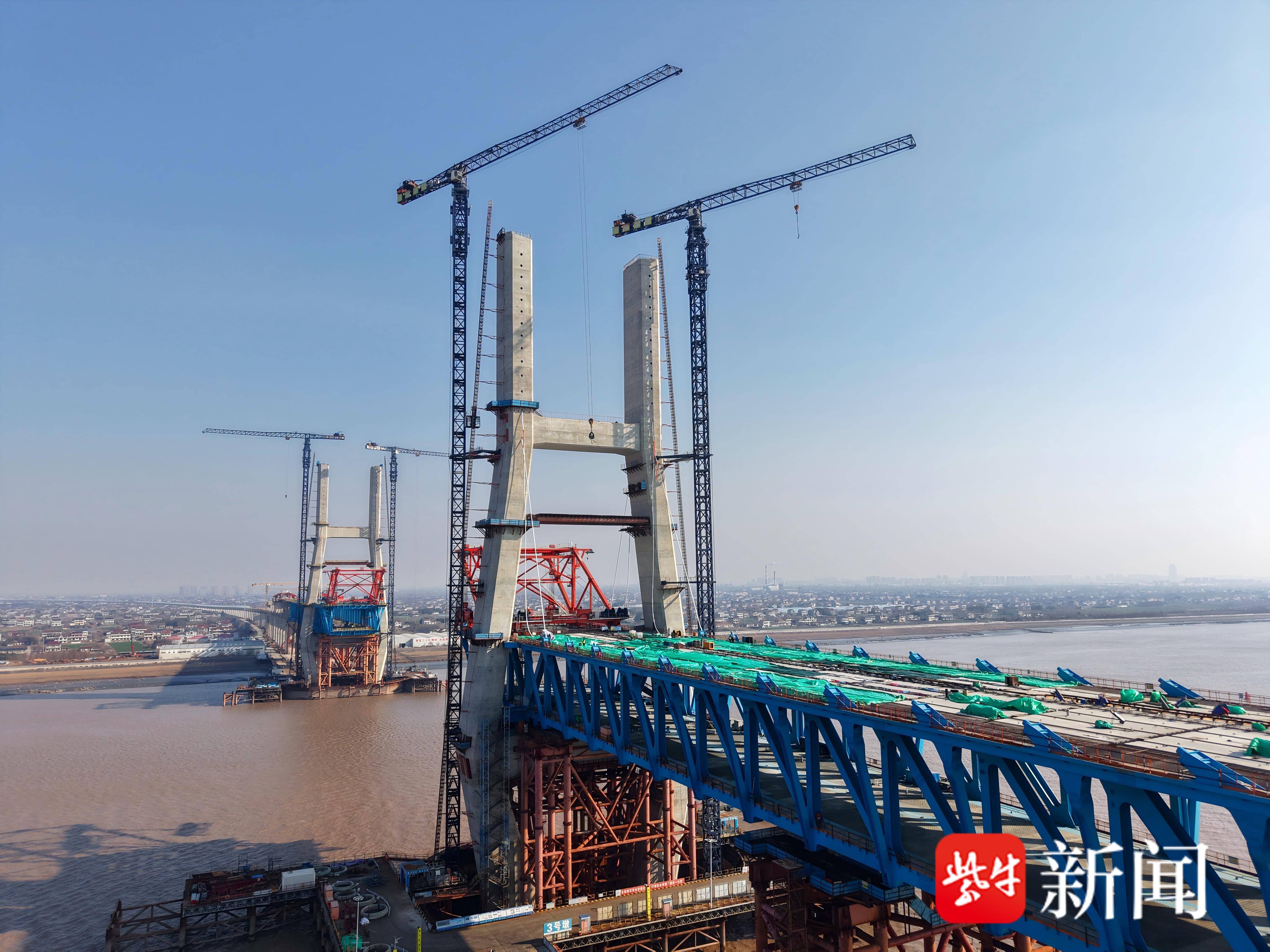 据悉,大桥公路面南侧边跨混凝土桥面板已铺装完成,中跨侧混凝土桥面板尚未铺装,预计本月23日进行中跨南侧悬臂钢梁吊装。