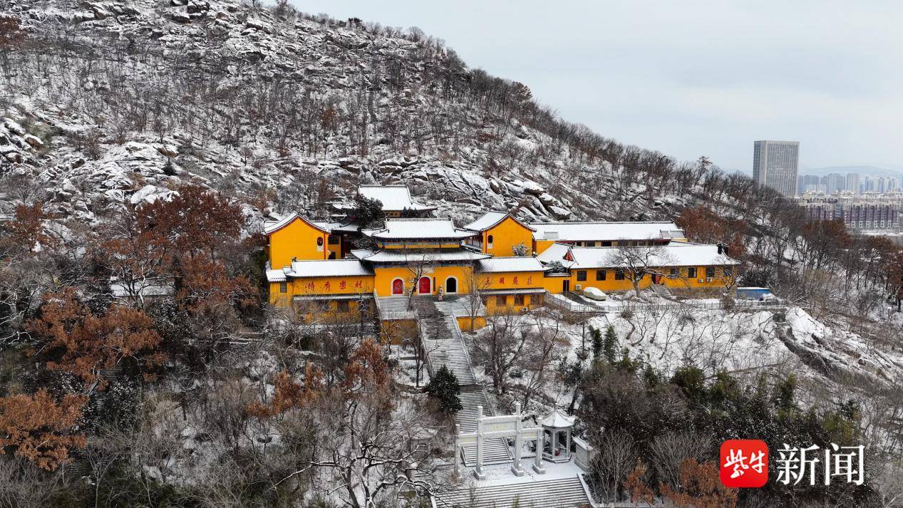 雪后的孔望山,宛如被施了魔法的水墨画。蜿蜒的登山步道被白雪均匀覆盖,踩上去咯吱作响,留下一串串浅浅的脚印。遒劲的树枝上凝结着薄薄的霜花,在微风中轻轻摇曳,似是在向游人招手。山中的龙洞庵,黄墙黛瓦在白雪的映衬下更显古朴雅致,飞檐上垂落的冰棱晶莹剔透,与庵内的红漆门窗相映成趣,处处透着浓郁的古意。登临山顶极目远眺,银装素裹的海州城尽收眼底,错落有致的房屋、纵横交错的道路,都被白雪勾勒出柔和的轮廓,雪后放晴之时,暖阳洒下,霞光映雪,天地间一片澄澈,景致美不胜收。