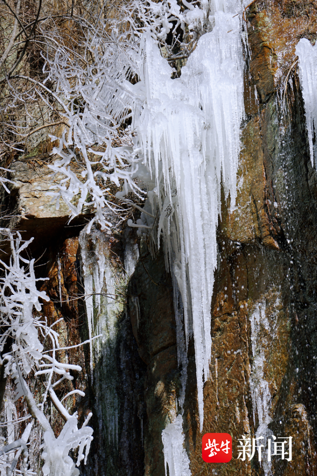 奇石峭壁上的冰挂与湛蓝天空形成强烈视觉反差,草木枝桠间的雾凇如绒毛般轻盈,步道两侧红枫、黄橡与松柏相映,构成一幅简约雅致的山水国画。漫步登山步道,脚下簌簌作响,身旁冰碴偶尔坠落,与山风、鸟鸣交织成自然的交响,深吸一口裹挟着草木清香的冷空气,恍若洗去尘世喧嚣,尽显生态本真之美。雾凇如精灵般栖息在枝桠间,与冰瀑的壮阔相映,构成“玉树琼枝”的诗意景致,一步一景皆为自然造化的鬼斧神工。