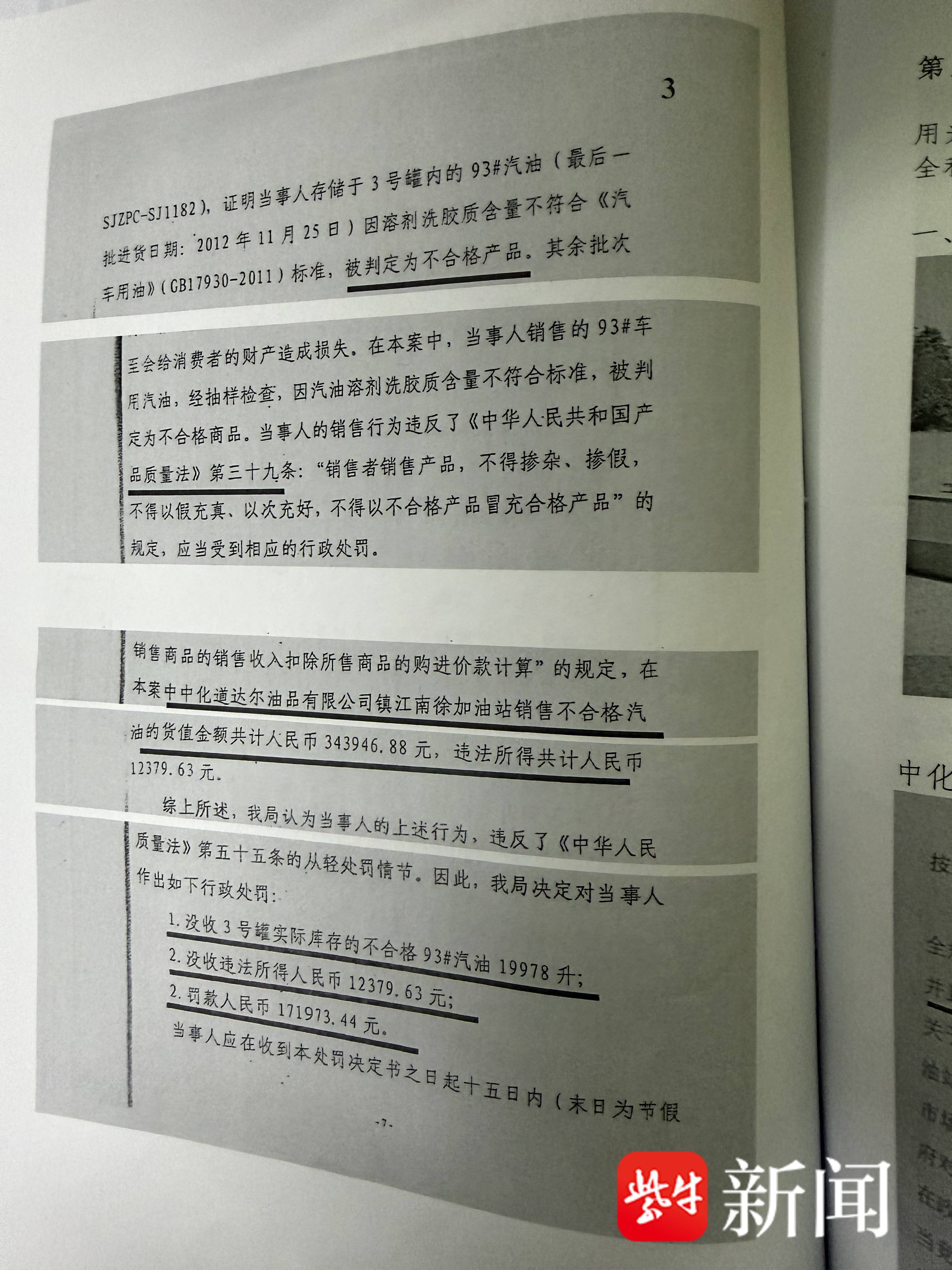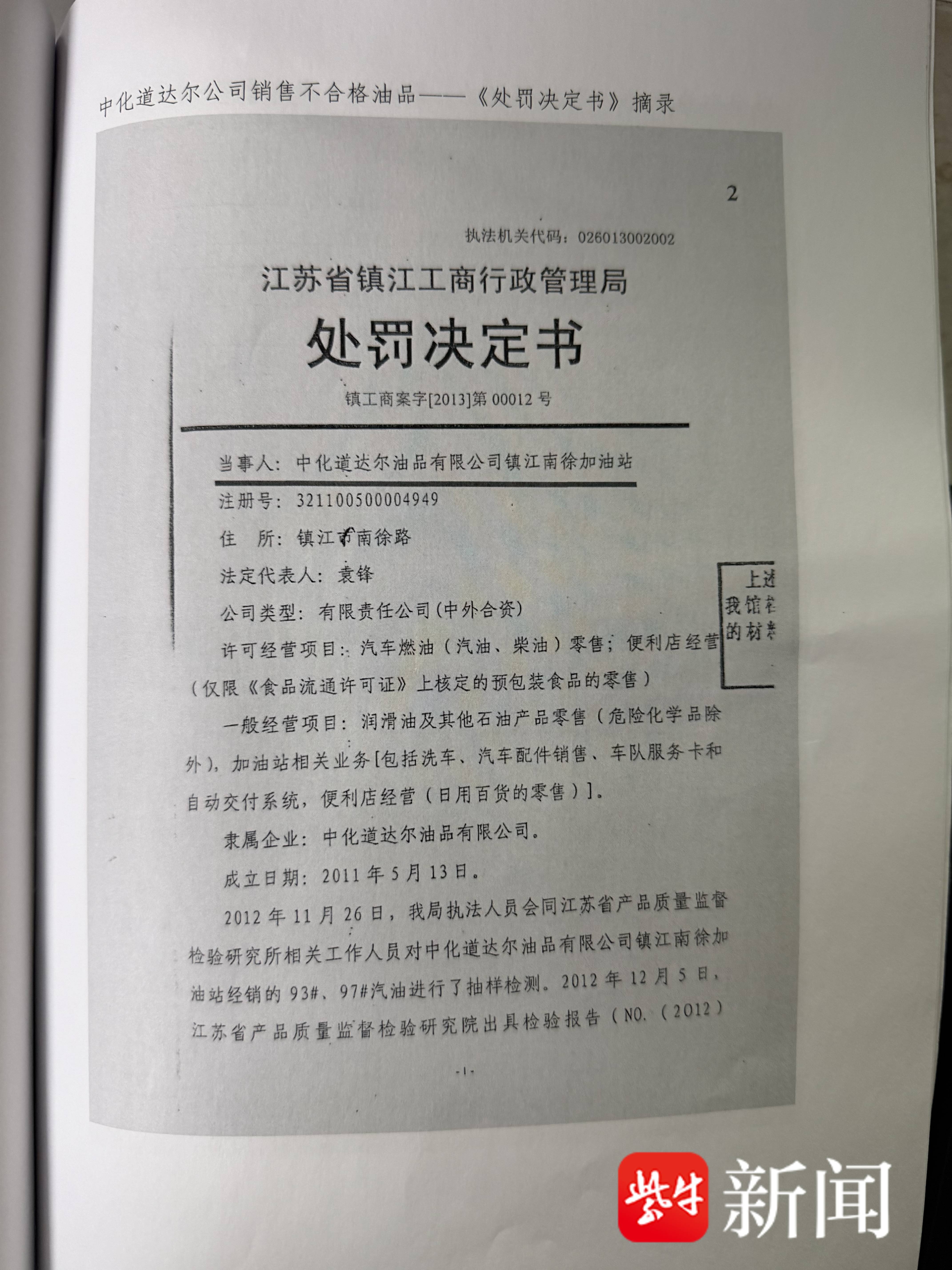 镇江市工商局润州分局 2013 年出具的《处罚决定书》(镇工商案字 [2013] 第 00012 号)认定,该加油站销售不合格汽油的行为违反《中华人民共和国产品质量法》,依法予以行政处罚。但中化道达尔公司在给京惠公司的回函中声称:“相关油品质量不合格事件已查清与我司无关且处理完毕”。