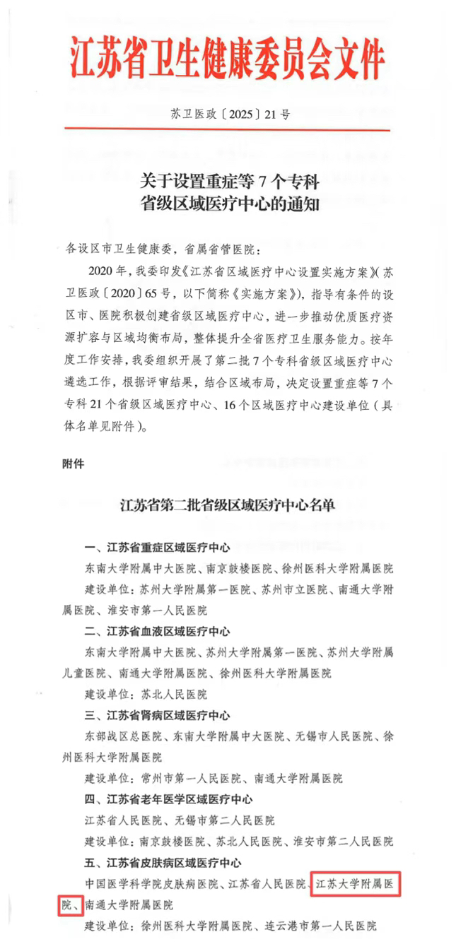 扬子晚报网1月22日讯(通讯员 钱小蔷 孙卉 记者 万凌云 姜天圣)近日,省卫健委公布了江苏省第二批省级区域医疗中心名单,江苏大学附属医院(又名镇江市江滨医院)成功获批“江苏省皮肤病区域医疗中心”,为镇江市首个也是目前唯一的省级区域医疗中心。