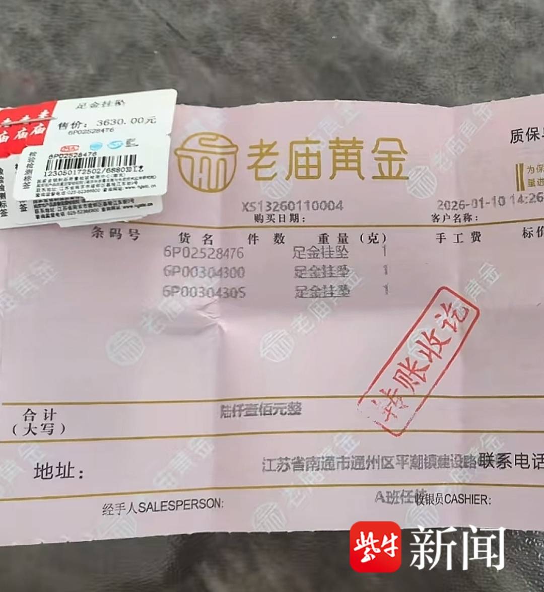 1月10日,南通市通州区一名居民在当地平潮镇的老庙黄金店,花6100元买了三件一口价黄金饰品,购买时店员并未告知金饰具体克重,只称“一口价黄金不用看克重,算下来相差不大。”这位居民没有多想就直接付款购买。