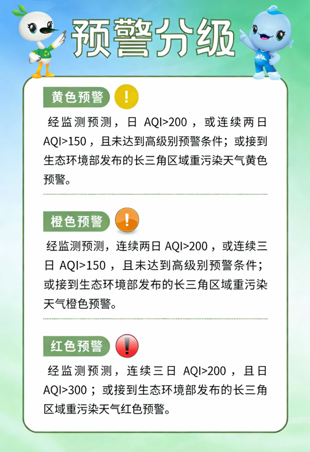 重污染天气预警统一采用空气质量指数(AQI)为分级指标,日AQI可按连续24小时(跨自然日)计算。按照污染程度和持续时间,将预警划分为3个等级,由轻到重依次为黄色预警、橙色预警、红色预警。