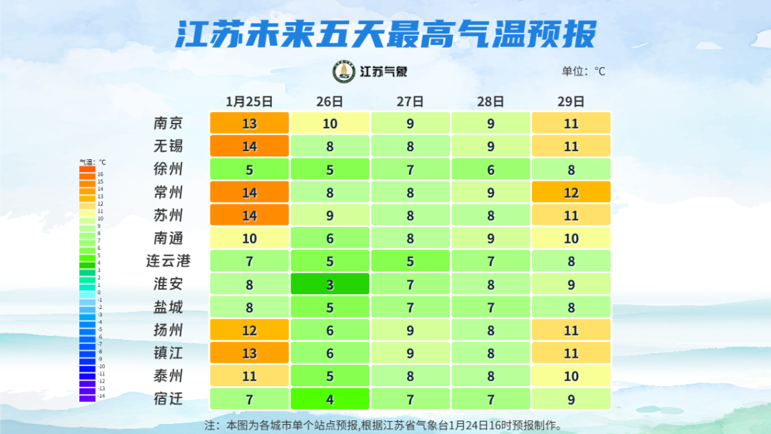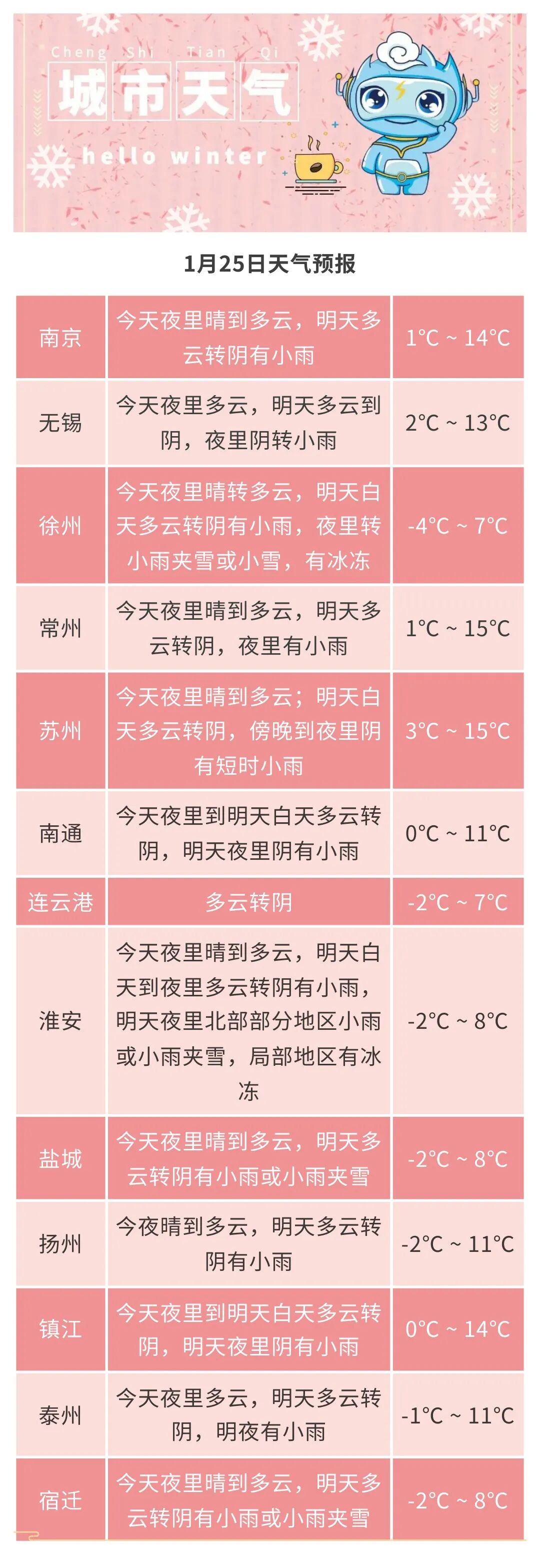 沿江以北地区西部多云转阴有小雨,其他地区多云转阴。最高温度:淮北地区7℃左右,苏南地区13~14℃,其他地区9~10℃;最低温度:淮北地区-2℃左右,苏南地区1~2℃,其他地区0~-1℃。全省偏东风3-4级逐渐增强至4-5级阵风6级。