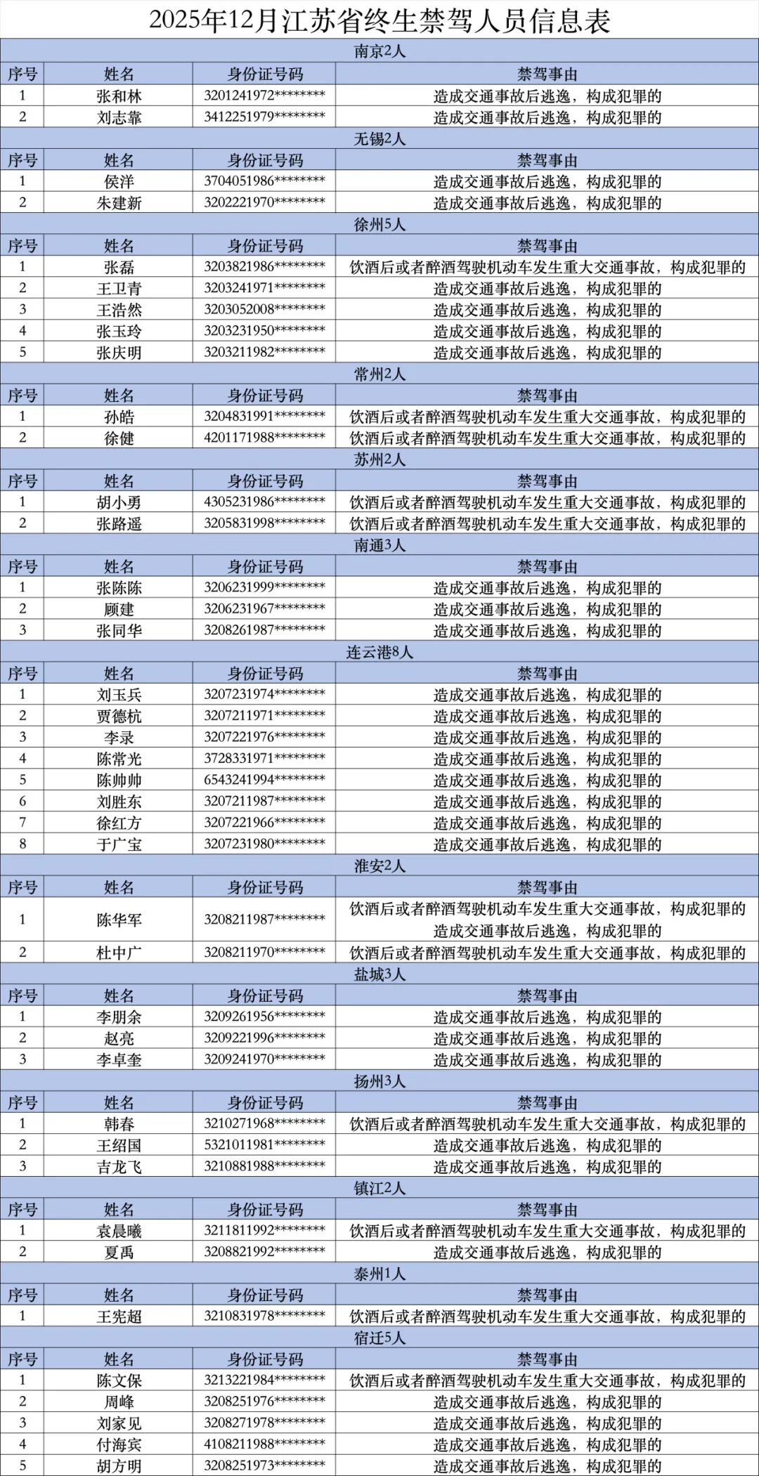 为全力以赴防风险除隐患、保安全保畅通,努力以高水平安全保障高质量发展。2025年以来,江苏交警持续开展“五大曝光”行动,加大对严重交通违法犯罪行为的曝光力度,充分发挥教育引导、警示震慑作用。据统计,2025年12月,全省共计40人被依法吊销机动车驾驶证,且终生不得重新申领。现将名单予以曝光。