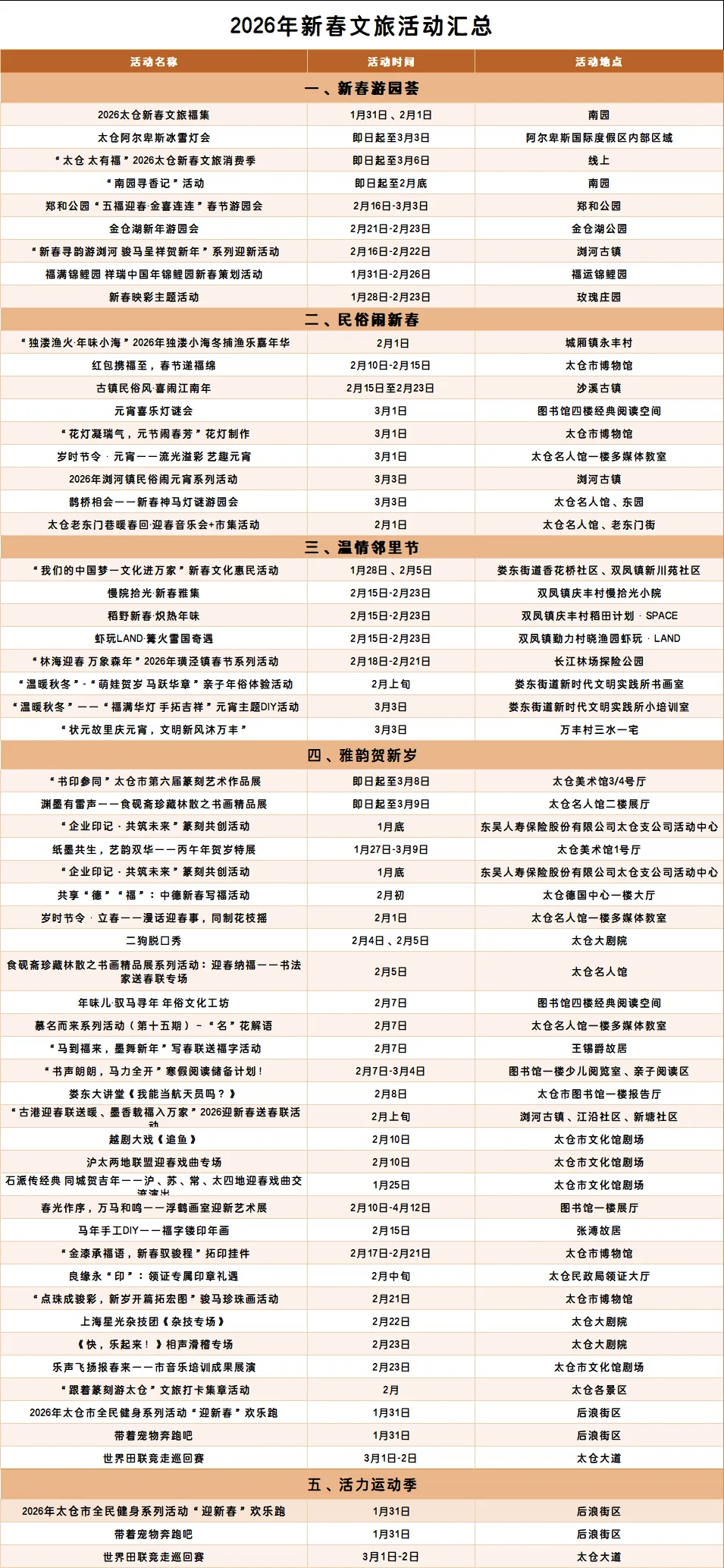 活力运动季:“迎新春”欢乐跑、“带着宠物奔跑吧”等群众性体育活动,让市民在运动中迎接健康新年;世界田联竞走巡回赛等专业赛事落地太仓,同步开展“跟着赛事游太仓”活动,实现体育与文旅深度融合。