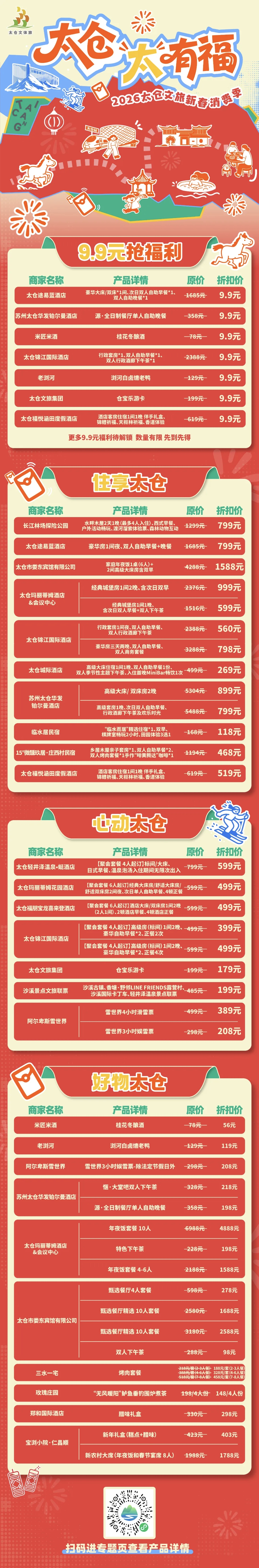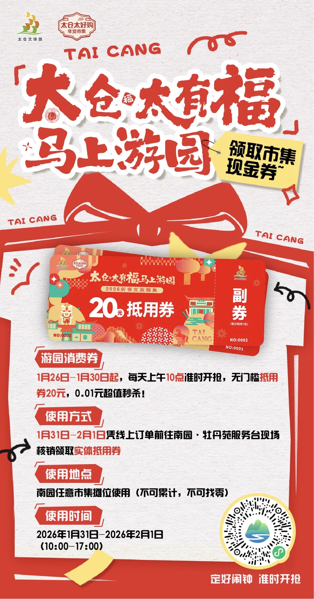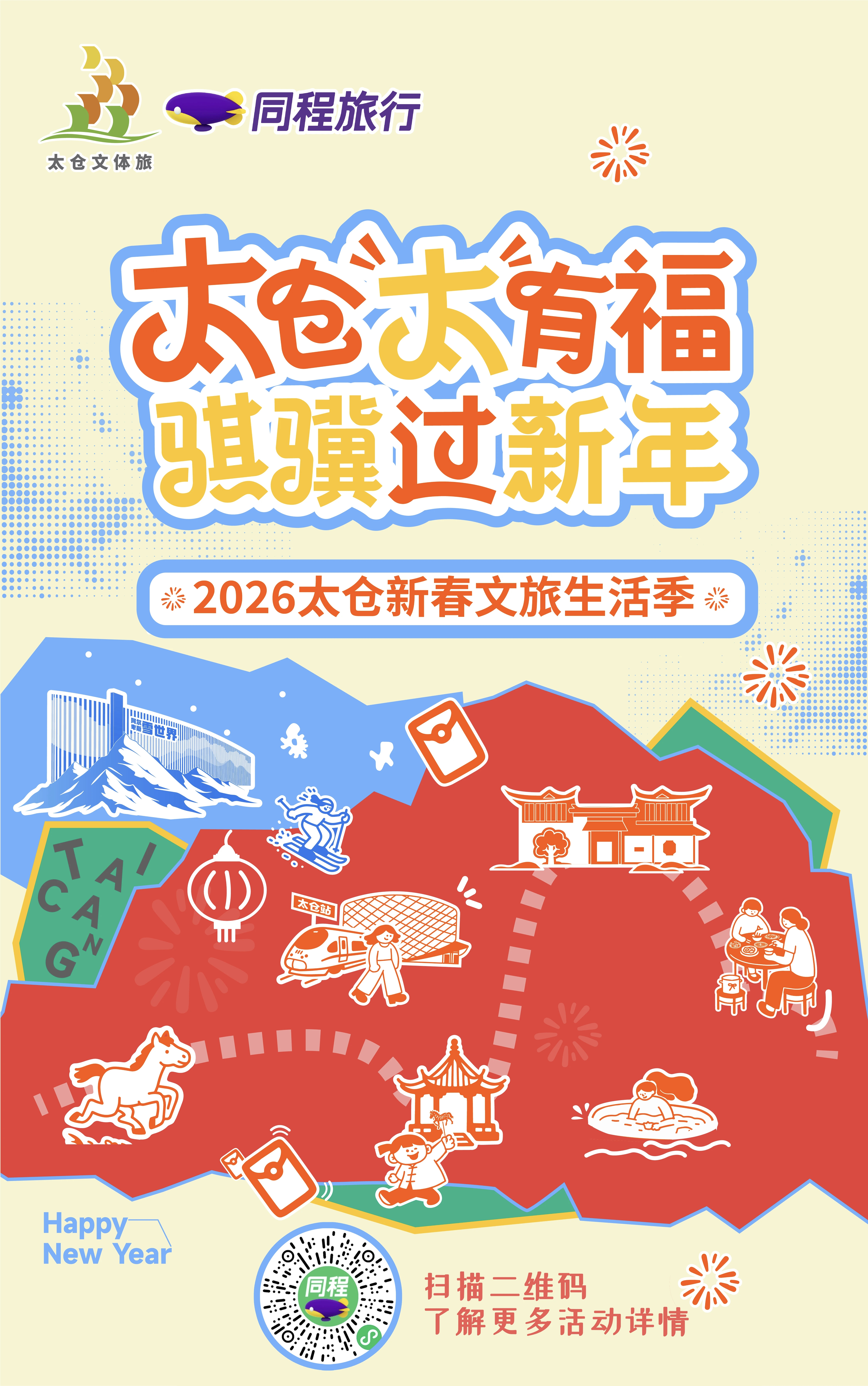 为深入贯彻“文旅带动、场景推动、活动拉动、产业联动”工作要求,太仓市正式发布“太仓太有福 骐骥过新年”2026太仓新春文旅生活季。本次活动统筹整合全市景区、乡村、文博场馆、酒店等优质文旅资源,推出五大主题56项系列活动、三大消费场景、38条文旅优惠措施及10条惠民举措,以丰富多元的文旅供给激活市场活力、拉动消费增长,为新春佳节注入浓厚喜庆氛围与独特文化魅力。