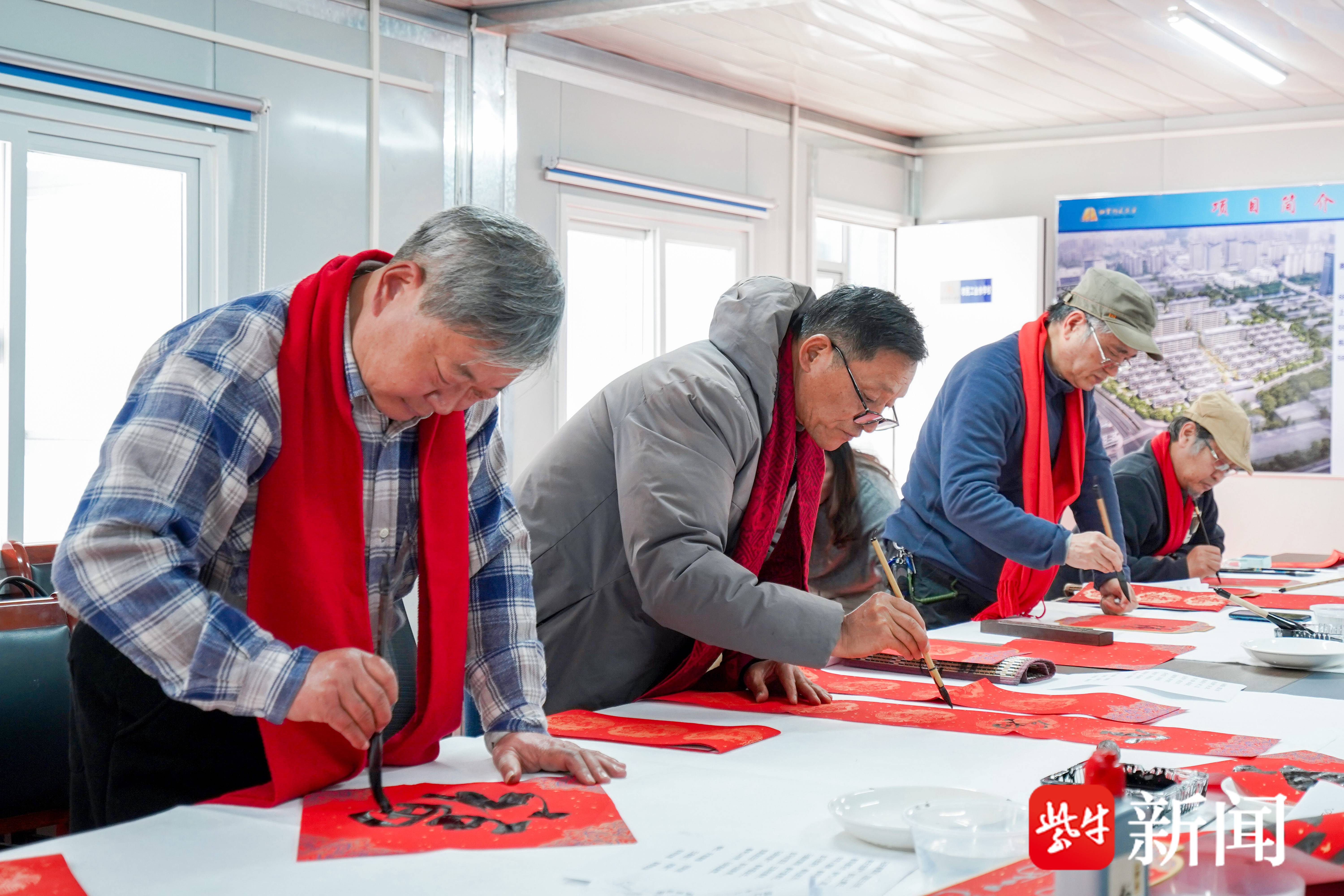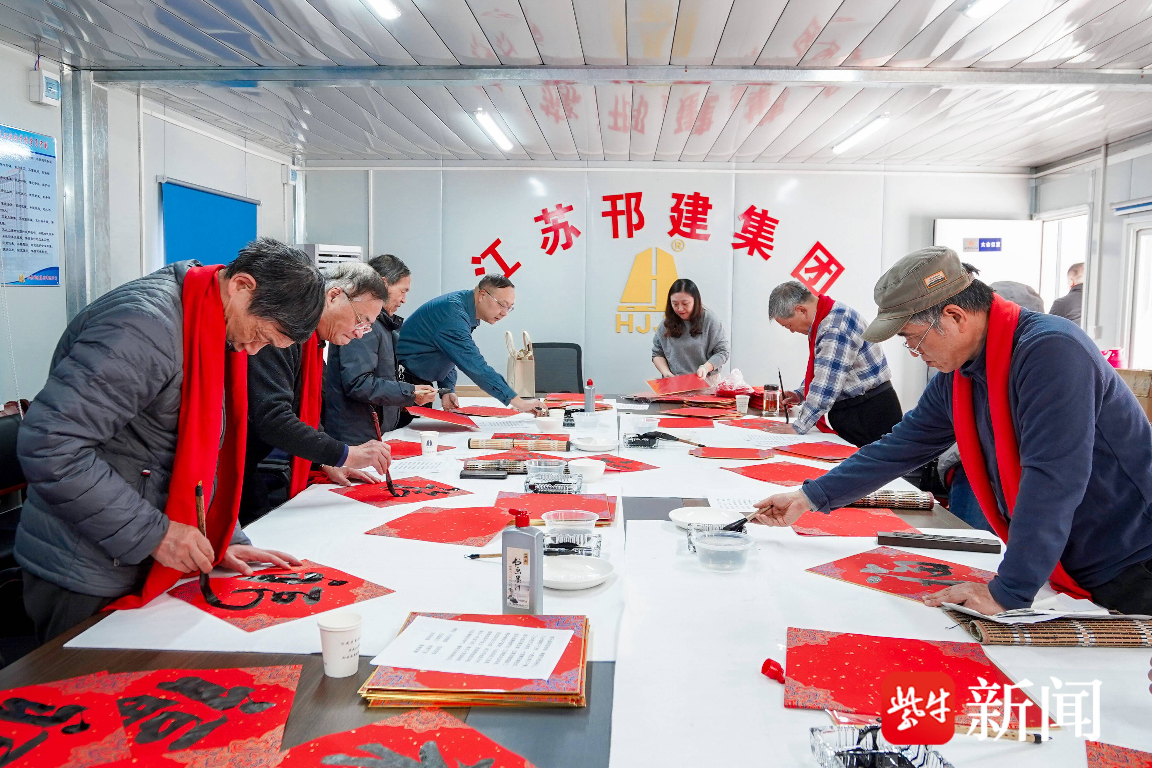 扬子晚报网1月29日讯(通讯员 杨小蓓 周尚仁 记者 陈咏)隆冬腊月,春节临近,“年味”渐浓。天气寒冷,户外工作人员尤其辛苦。28日,扬州邗江区蒋王街道江苏邗建集团山河序建筑工地上,来了10位书卷气十足的特殊客人,他们手拎工作包,一到工地,便在操作台上铺开大红宣纸,饱蘇浓墨,激情挥毫。随着笔锋或抑或扬,一副副遒劲洒脱、饱含神韵的春联和福字新鲜出炉。浓浓的情意、真诚的祝福,在大红宣纸上展现。