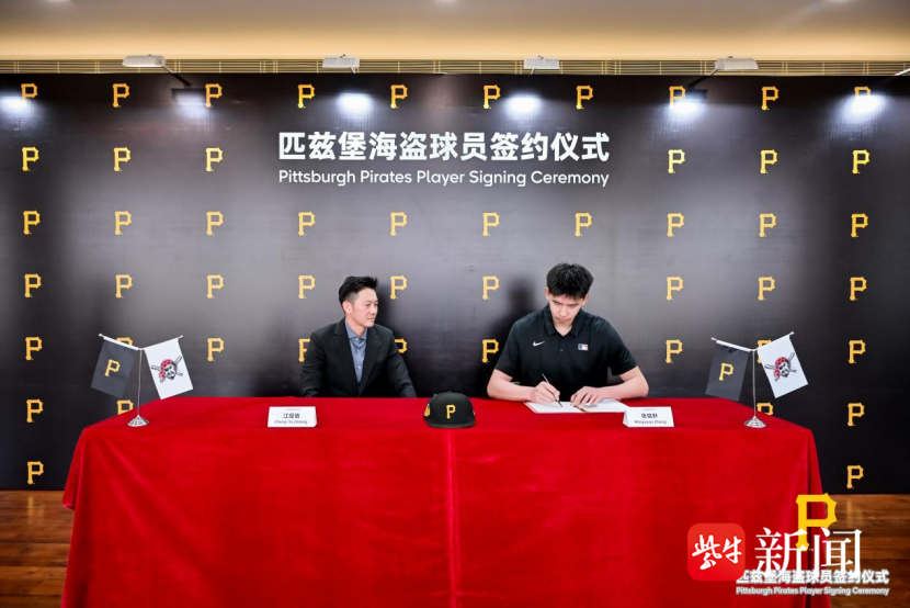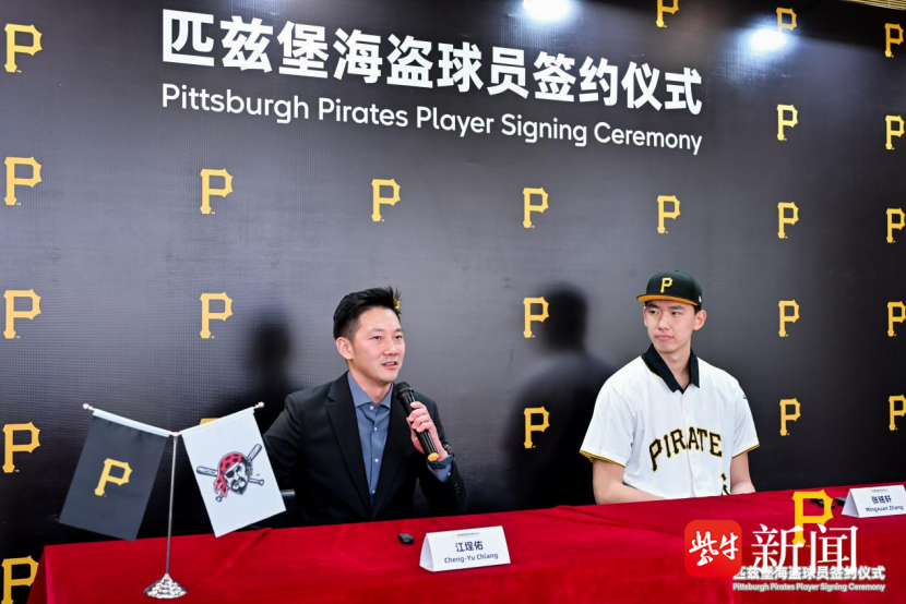在现场嘉宾的共同注视下,MLB匹兹堡海盗队国际球探部副总裁首席助理江埕佑与张铭轩共同落笔签字,定格了这位中国少年通往世界顶级棒球殿堂的历史性一刻。随后,江埕佑为张铭轩戴上了MLB匹兹堡海盗队球帽,并授予球衣。