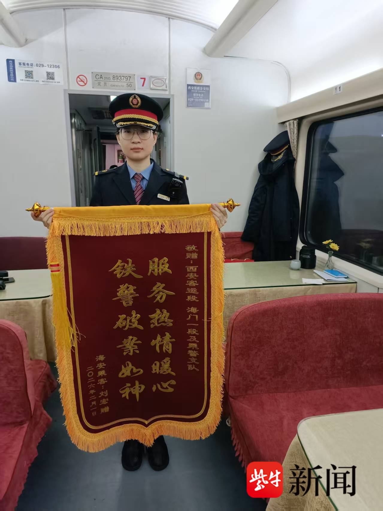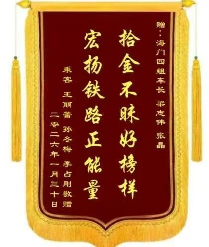 事后,为感谢车长拾金不昧的高尚品德与高效贴心的服务,王女士特意制作了一面锦旗赠予海门乘务组,用实际行动为铁路人的诚信担当点赞。此次事件中,张晶车长以严谨负责的态度、及时高效的处置,不仅为旅客挽回了财产损失,更彰显了西安客运段职工践行诚信服务、传递温暖正能量的良好风貌。(陈杰钢)