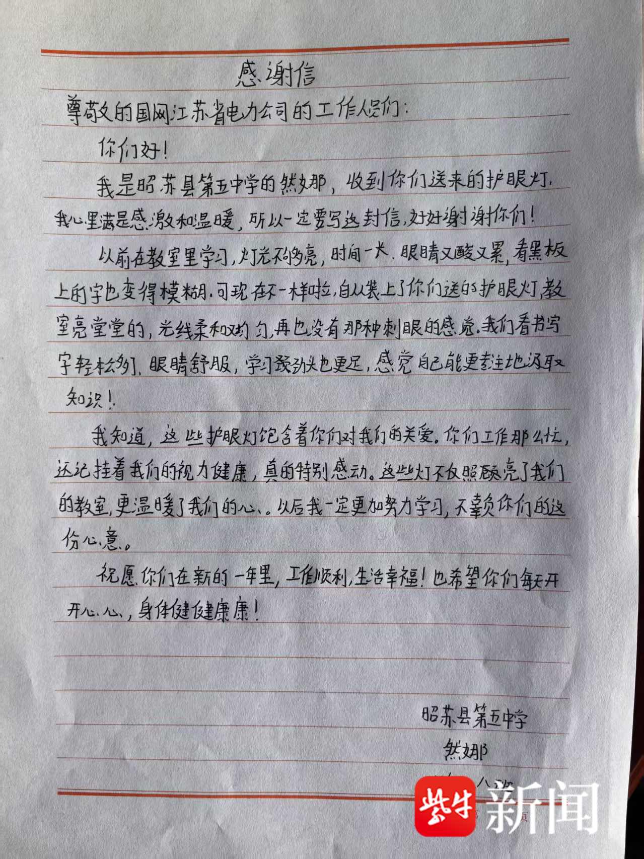 灯光暖了教室,更牵起了情谊。感动于学习环境的巨变,然娜写下手写信,“这些灯不仅照亮了教室,更温暖了我们的心”。这封质朴真挚的书信,成为苏疆两地学子友谊的起点,也让帮扶从硬件改善延伸至情感联结。