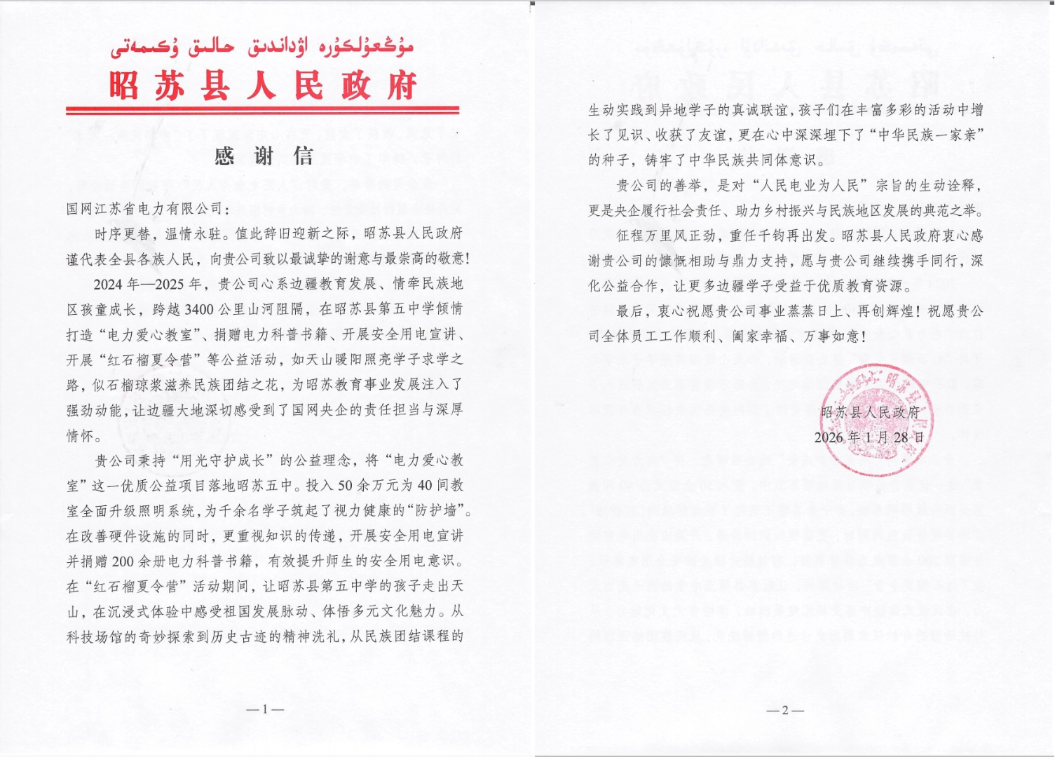 1月28日,一封来自新疆昭苏县人民政府的感谢信跨越3400公里,从天山北麓寄至国网江苏省电力有限公司,字里行间满含诚挚谢意,既是对该公司三年来助力昭苏教育发展的认可,更是苏疆助学情谊的生动见证,奏响了一曲藏在灯光里、跨越山河的民族团结同心曲。