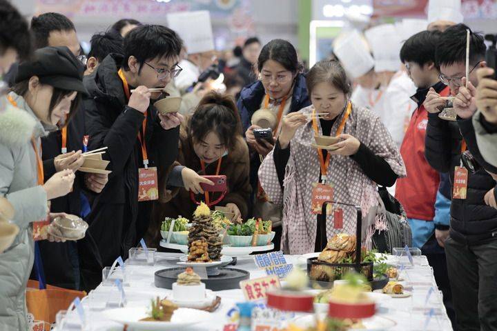 1月31日,在“我是厨神”美食嘉年华凉菜区,游客们正在夹菜品尝、打卡拍照。新华社发(刘臻睿 摄)