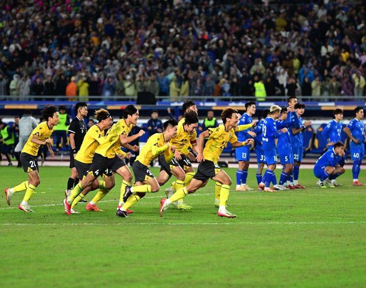 2025年10月18日,在“苏超”半决赛,泰州队点球战胜南京队晋级决赛,泰州队球员庆祝胜利。新华社发(曹政 摄)