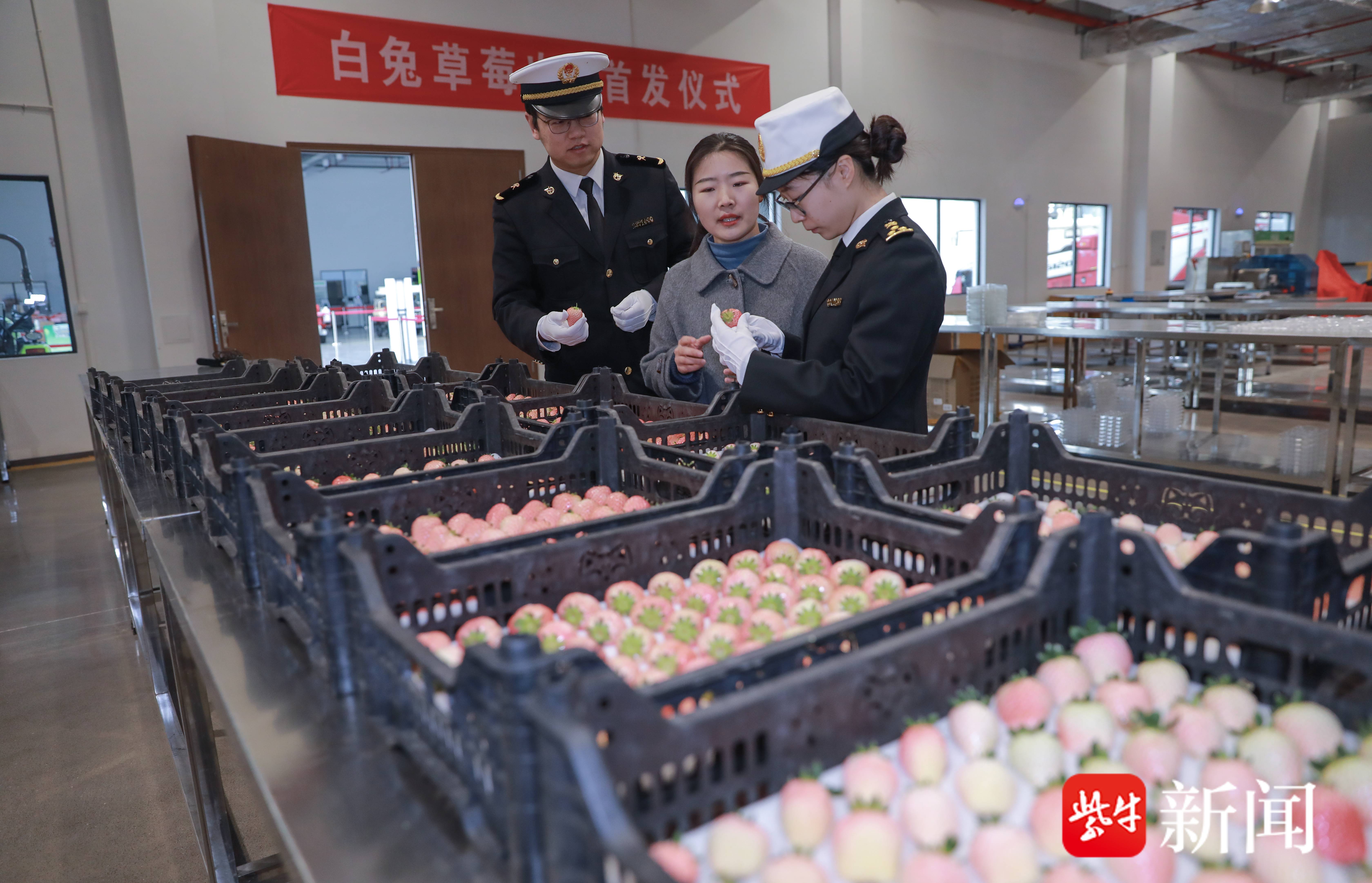 镇江海关一级行政执法员赵亮告诉记者:“我们海关在草莓生长期间开展田间管理和有害生物监测,协助企业完善自检自测质量安全控制体系;提前预约,现场实施检验检疫,合格后即刻出具证书,保障鲜食水果新鲜度。”