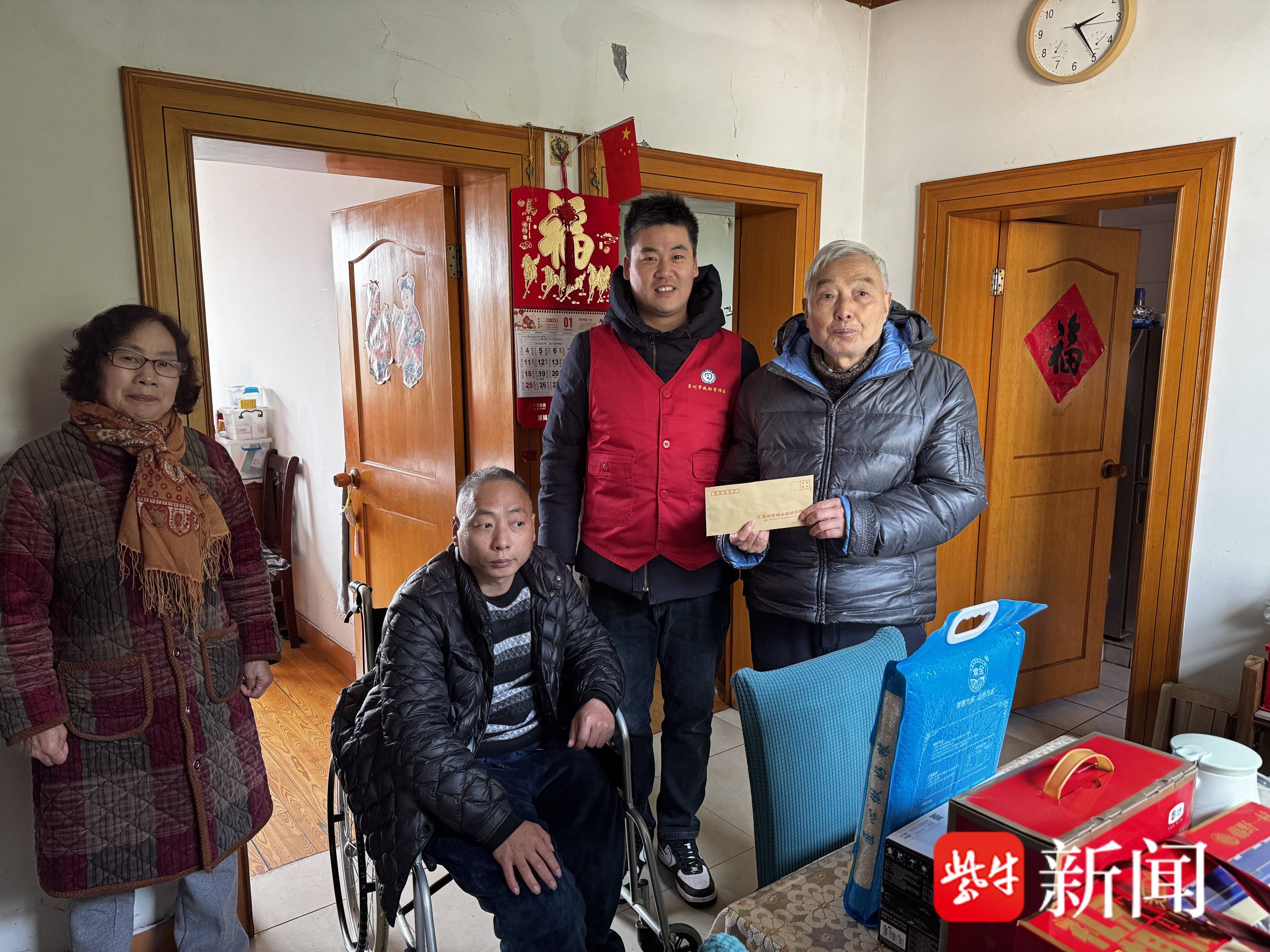春节前最后一场慰问,工作人员来到沈娣租住的小屋。沈娣丈夫早逝、患有精神残疾,多年前走失漂泊,后经当地救助机构核实身份,被安全护送返乡。如今,她与同样残疾的女儿、女婿相依为命,日子清贫却安稳。