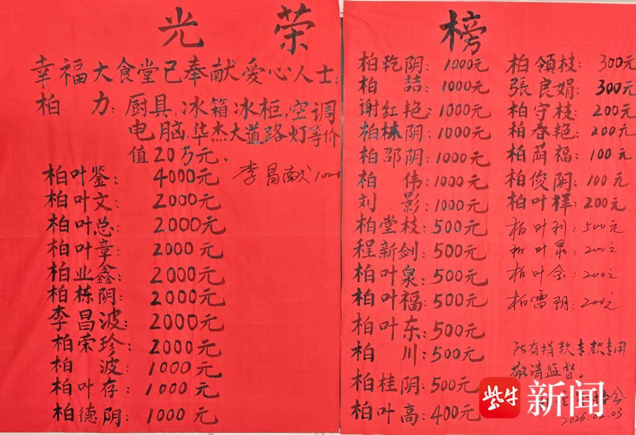 开业现场,整洁明亮的食堂内秩序井然,老人们有序取餐、围坐畅谈,可口的饭菜香气四溢。“以前一个人做饭又麻烦又冷清,现在花3块钱就能吃到热乎饭,太贴心了!”83岁的袁春芳大娘一边用餐,一边笑着夸赞。墙上张贴的光荣榜,记录着乡贤乡邻的爱心善举,让这份“幸福味道”更添温情。