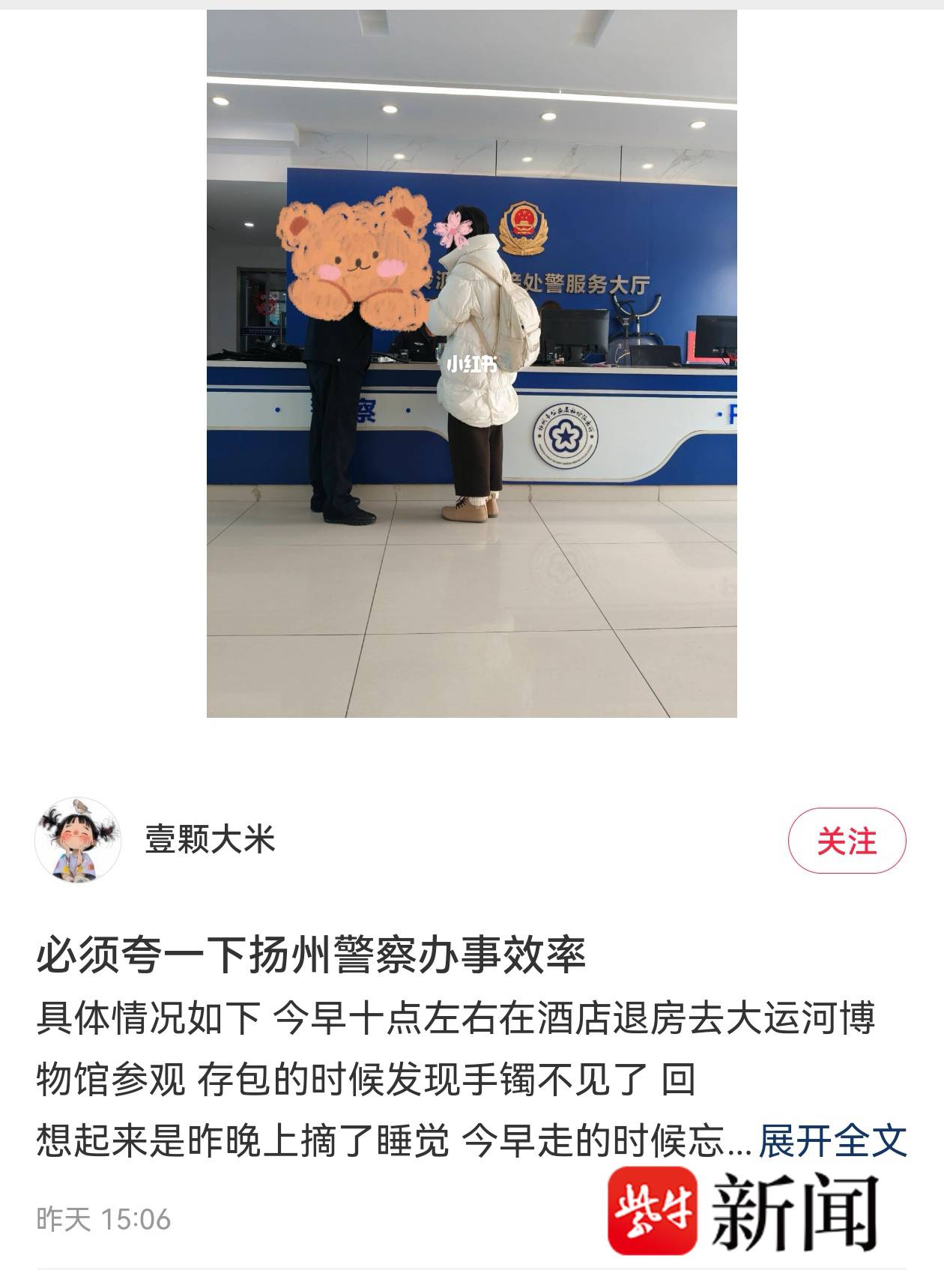 “必须夸一下扬州警察的办事效率”,游客手镯失而“速”得,社交平台发文点赞