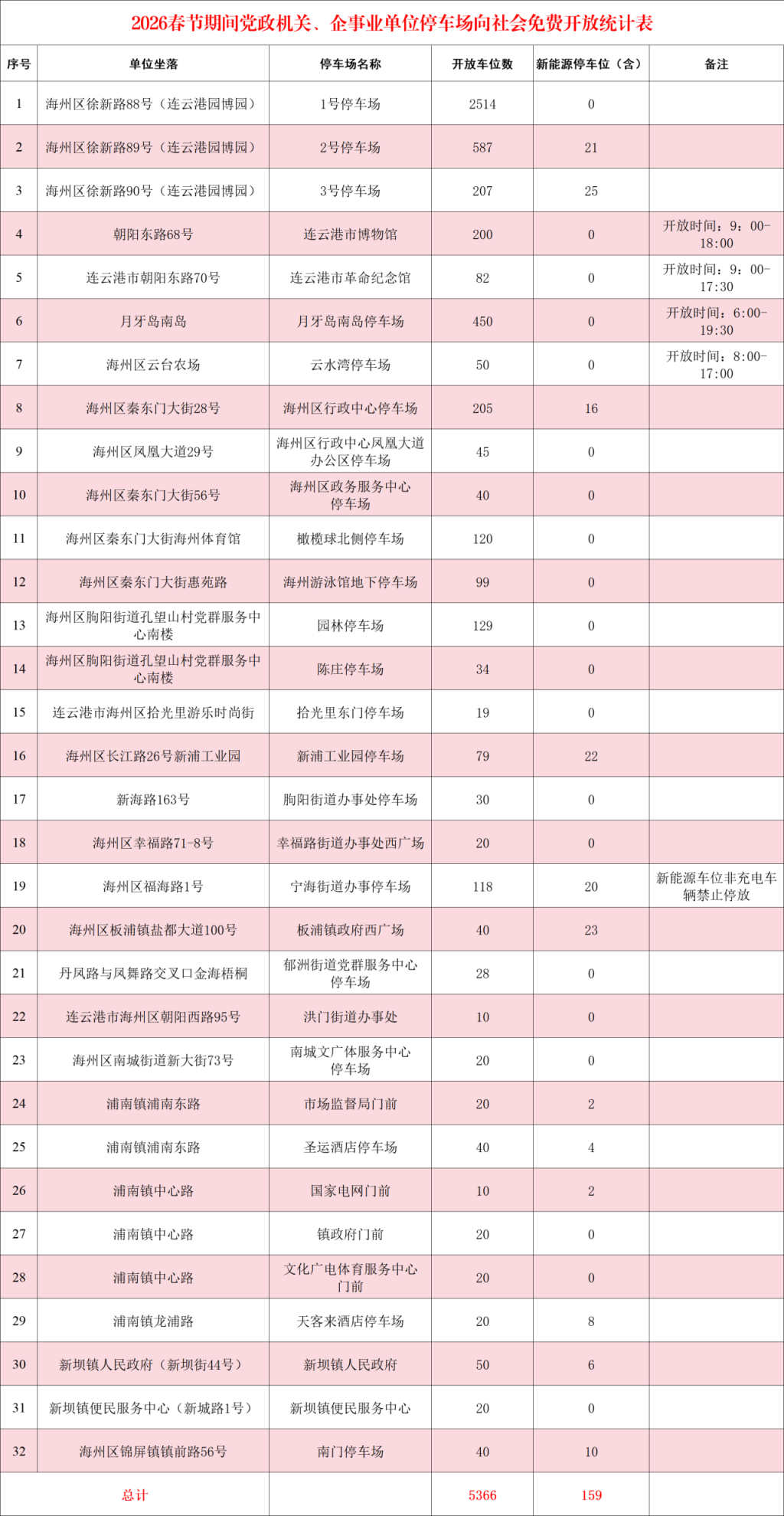为缓解春节出行停车压力,海州区32处党政机关、企事业单位停车场同步开放,涵盖园博园1-3号停车场(共3308个车位)、连云港市博物馆(200个)、月牙岛南岛停车场(450 个)等重点区域,其中包含159个新能源停车位(部分区域新能源车位仅限充电车辆停放)。部分停车场设有开放时间限制,如连云港市博物馆为9:00-18:00,月牙岛南岛停车场为6:00-19:30,具体以各停车场实际运营为准。