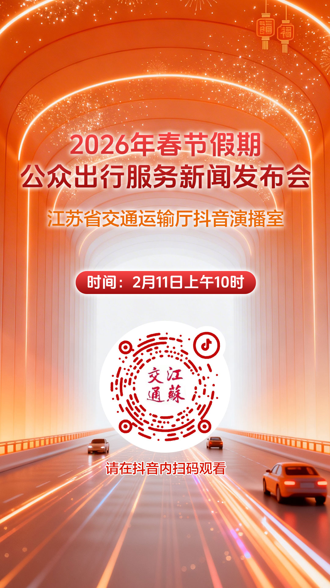 新闻发布会将于2026年2月11日上午10时在“江苏交通”抖音号全程播出,请在抖音内扫码收看。