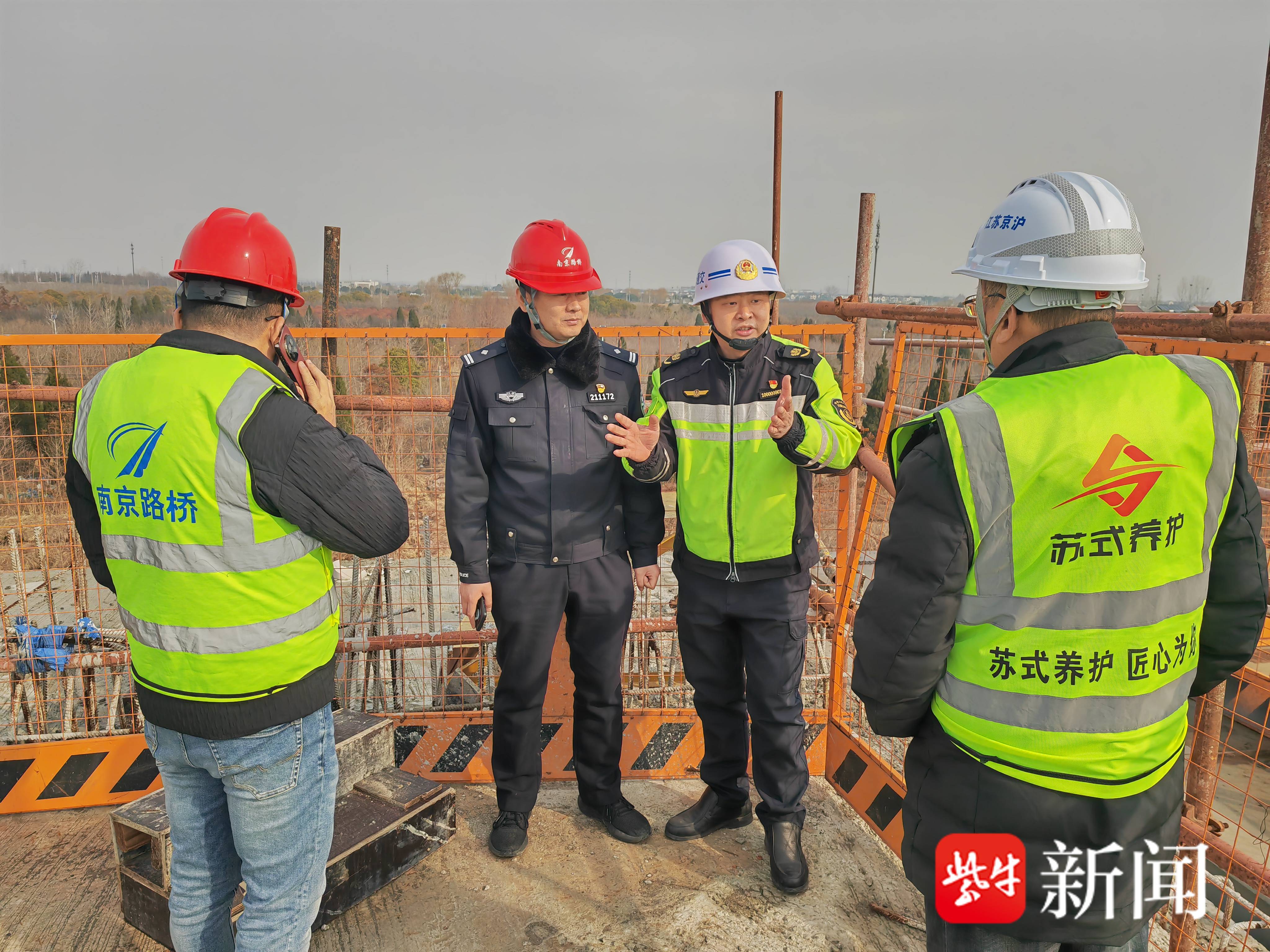 在G328上跨G40沪陕高速六合东枢纽的施工现场,检查组登上离地约18米高的顶推钢箱梁,实地检查顶推施工现状、箱梁内部排水设施以及高空防坠落措施是否符合技术规范。同时,重点查看了因施工封闭的匝道区域,检查了上下游警告区、过渡区等作业区的科学划分情况,以及交通安全标志设置、警示锥筒摆放的规范性和施工人员自身安全防护是否到位。检查组明确要求施工单位在春运期间暂停涉路施工活动,但必须定时巡查,确保已设置的施工安全标志齐全、完好、有效,全力为春运及春节期间高速公路的安全畅通提供坚实保障。