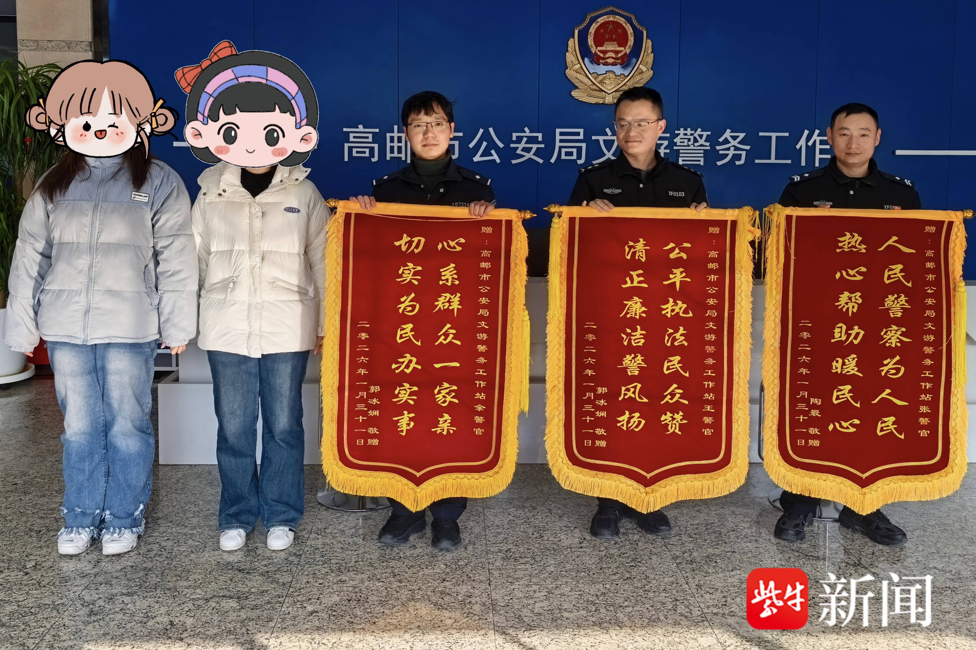 扬子晚报网2月12日讯(通讯员 戴婷 记者 陈咏)11日,农历腊月二十四,南方小年。16时许,高邮市公安局巡特警大队文游警务站出现暖心一幕:市民郭女士、陶女士专程送来三面锦旗,向民警王锦及辅警致谢,感谢事发当天他们的热心帮助。