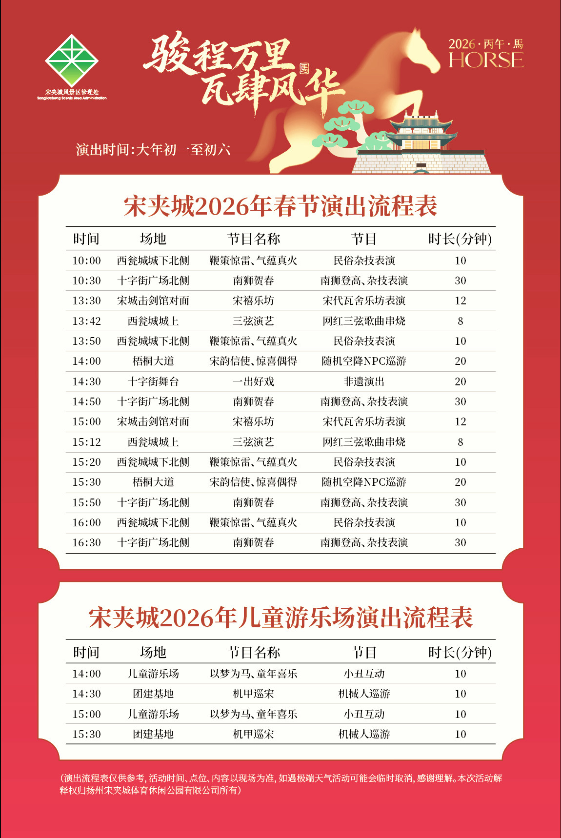 扬子晚报/紫牛新闻记者2月12日从扬州获悉,马年春节将至,为弘扬传统民俗、提升游园体验、激发消费潜力,宋夹城体育休闲公园将于马年农历大年初一至初六倾力打造“城好玩——骏程万里·瓦肆风华”新春盛会,邀请市民游客“来扬州 过大年 行大运”。