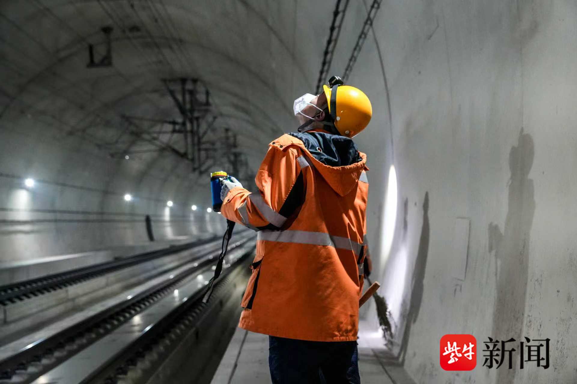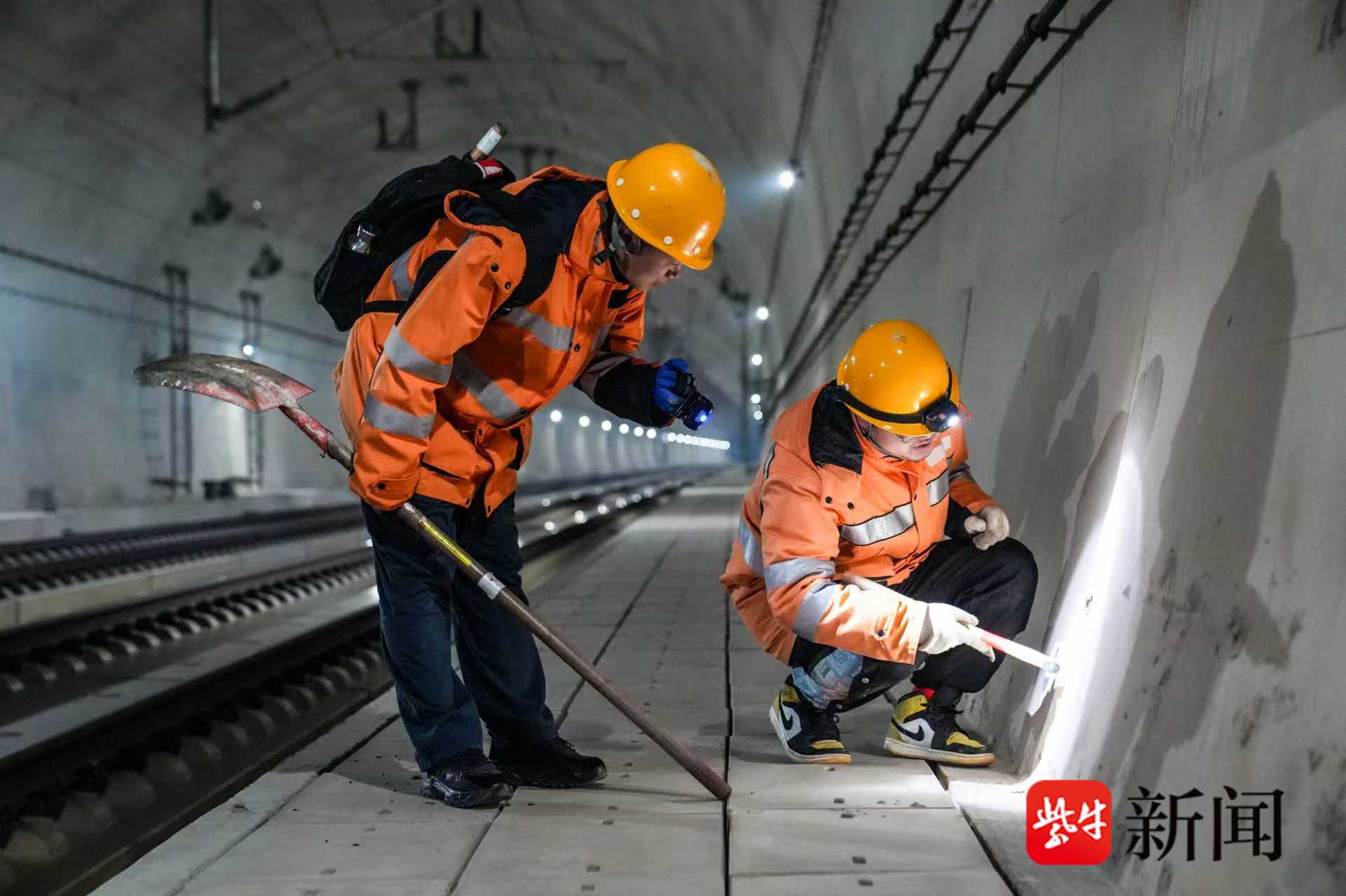 阳山隧道全长850米,最大埋深约120米,穿越茅山景区,地质条件复杂,围岩土质破碎的特点让隧道结构检修容不得半点马虎。作为沪宁沿江高速铁路的关键节点,春运期间途经隧道的列车班次大幅增加,列车通行带来的持续震动,极易让隧道衬砌、拱壁等结构出现细微裂缝、空鼓等隐蔽 “病害”,而这些潜藏的隐患,正是这支青年检修队伍春运期间重点排查的核心。