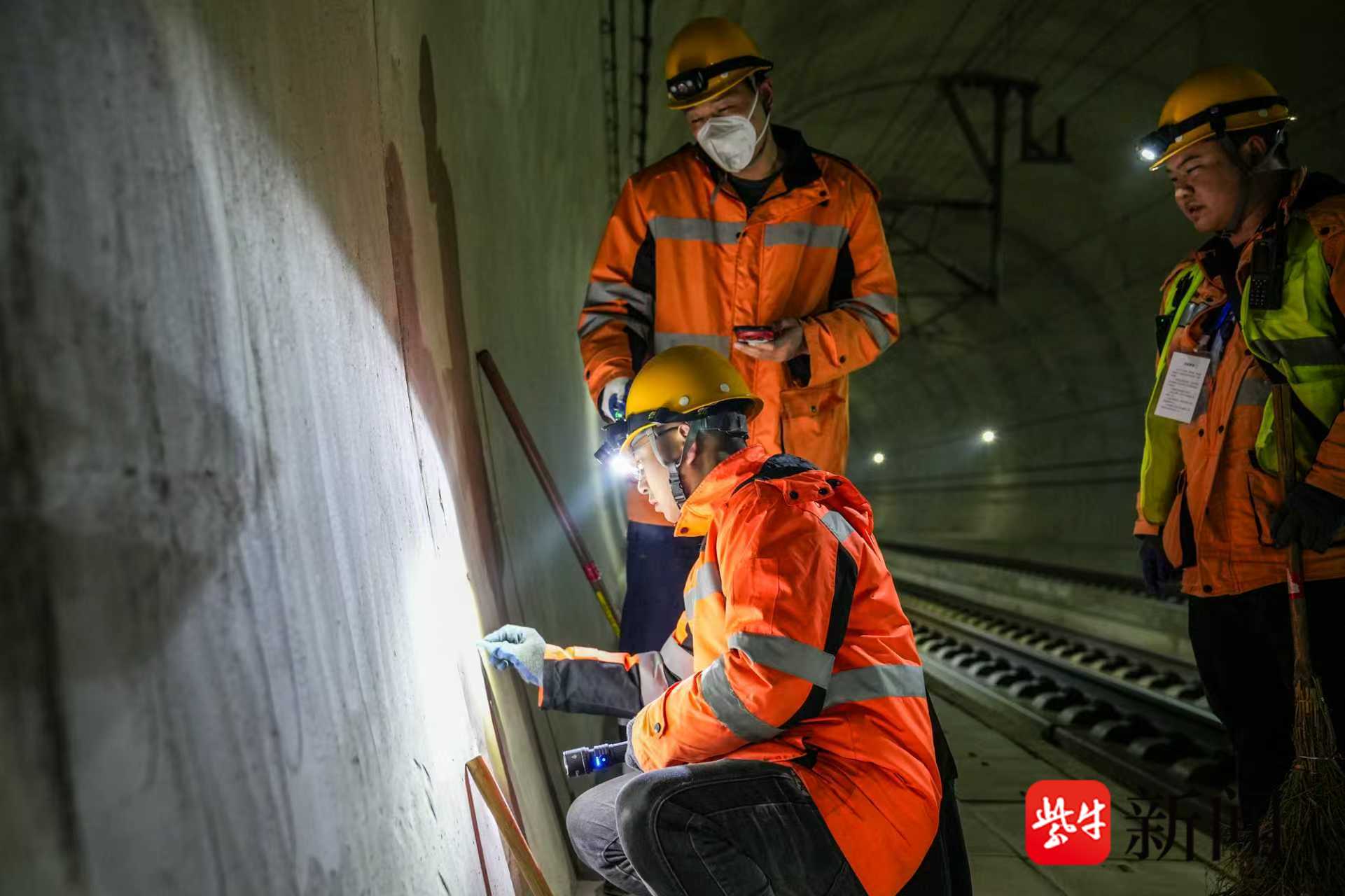 “作业后,力争零疏漏、零误差!”这是青年职工们的共同目标。随着天窗时间逐渐接近尾声,副工长周传磊带领大家开展全面的质量回检,对前期排查的可疑点位、检测的裂缝区域逐一复核,用检查锤再次确认结构状态,用裂缝测宽仪复校数据,确保所有隐患均被排查、所有数据均精准无误。凌晨的隧道里,数名头灯的光束交汇在一起,照亮了他们年轻的脸庞,也照亮了旅客的平安返乡路。