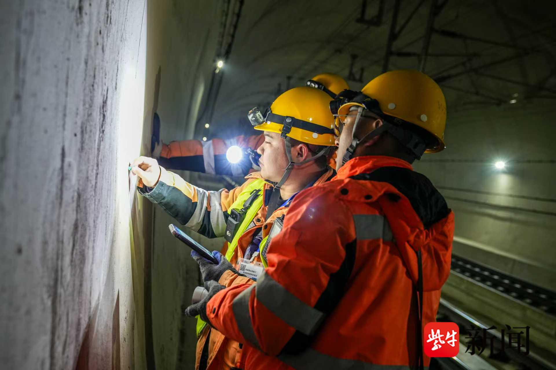 深夜的阳山隧道,褪去了白日的喧嚣,只剩头灯的光束在幽静的空间里穿梭。凌晨12点,当外界沉浸在梦乡,青年检修队员们已身着反光工作服,携带检查锤、裂缝测宽仪等专业工具,踏入了阴冷潮湿的隧道。“今晚是春节前最后一个天窗了,大家按分工推进,衬砌检查、裂缝检测同步进行,务必全方位排查,不放过任何一个细节!” 进隧道前,南京桥工段金坛高铁线桥车间金坛桥梁工区工长汪子博的叮嘱简洁有力,这是他们春运期间的工作常态,更是对铁路安全、旅客平安的郑重承诺。
