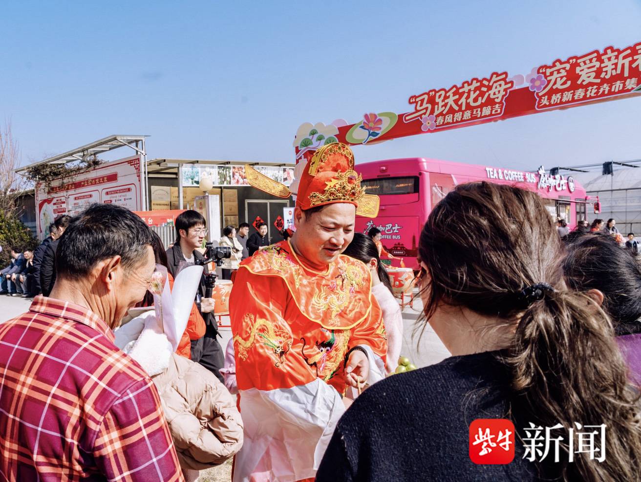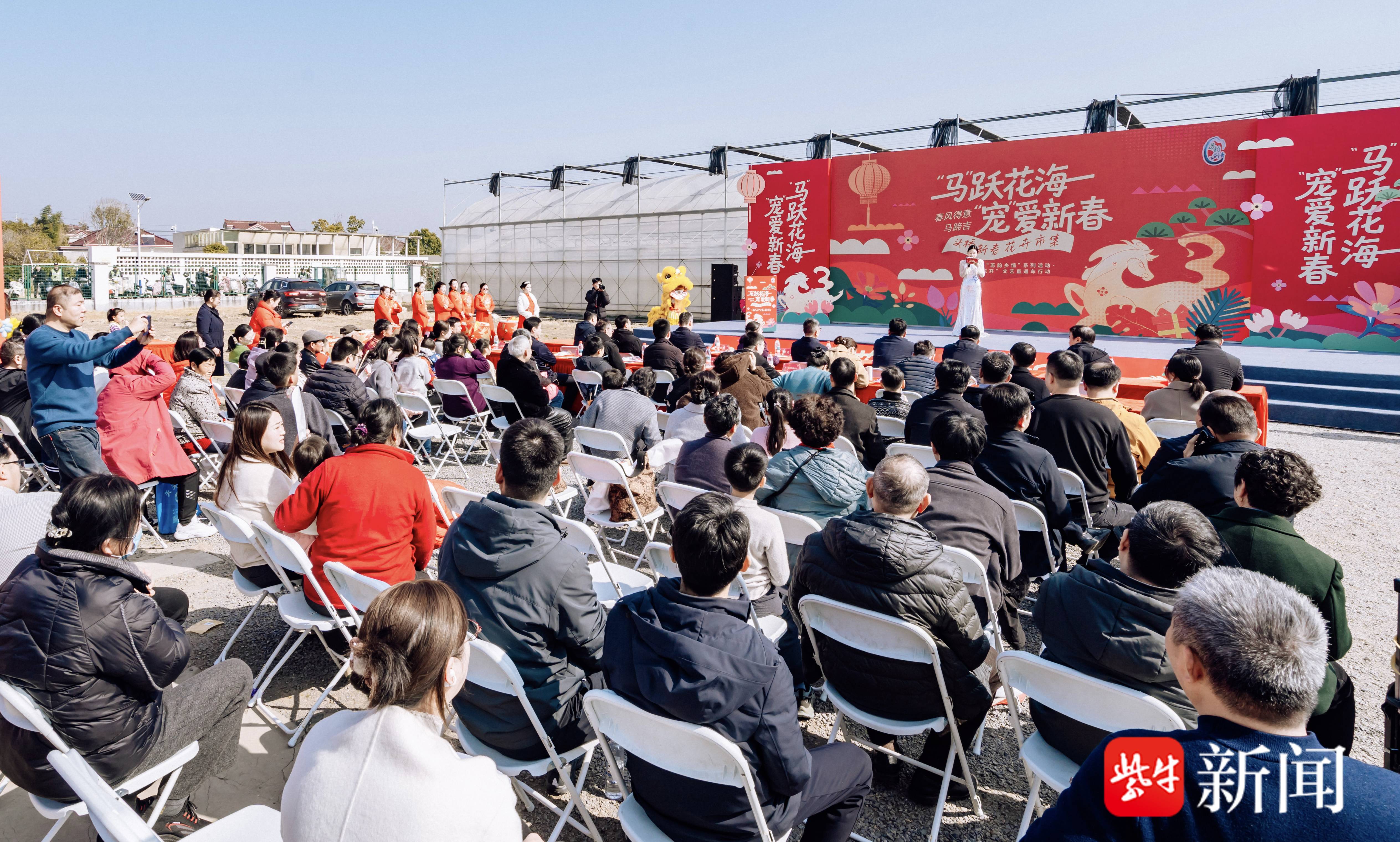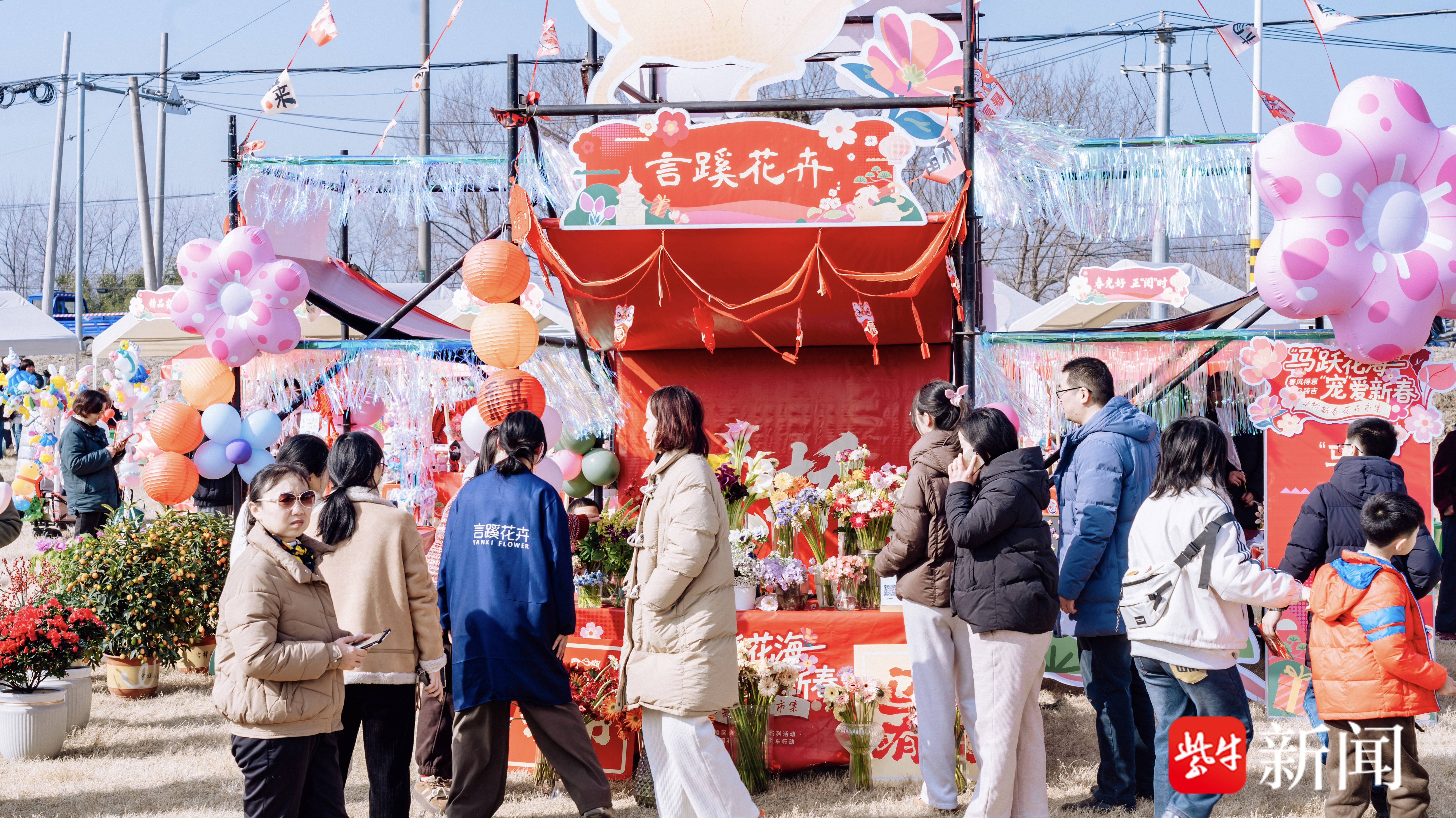 2月14日,腊月二十七,马年新春前最后一个工作日,空气里满是“年”的味道。扬州南郊长江边广陵区头桥镇言蹊花卉基地,张灯结彩,五彩斑斓,喜气洋洋。在当地和周边地区备受关注的“‘马’跃花海,‘宠’爱新春”新春花卉市集,在此热闹开市。扬子晚报/紫牛新闻记者置身其中,沉浸式感受这场融花卉展销、民俗体验、便民服务、萌宠互动于一体的新春盛会。记者发现,该活动本土烟火气与传统文化味浓郁,为马年春节添彩献瑞,展现江畔名镇、产业重镇头桥的蓬勃生机。