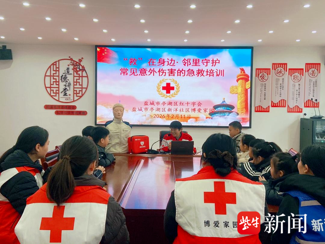 寒假期间,为切实增强辖区青少年儿童的安全防范意识和应急自救互救能力,2月11日下午,盐城市亭湖区新洋街道新洋经济区新时代文明实践所联合新洋社区新时代文明实践站、关工委、博爱家园,携手亭湖区红十字会,依托“新洋社区公益寒托服务”平台,精心组织开展“暖冬寒托行 安全‘救’在身边”主题宣教活动。活动聚焦日常生活中常见意外伤害的急救处置,通过理论讲解、情景模拟与实操演练相结合的形式,为孩子们上了一堂生动、严谨的生命安全课。