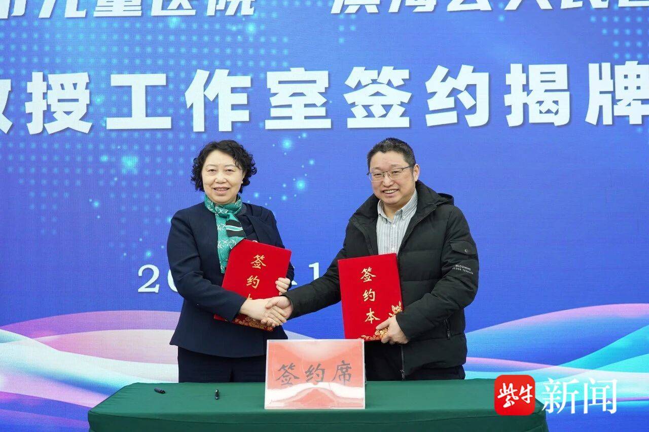 上海市儿童医院李嫔教授与滨海县人民医院党委书记戴斌共同签署“李嫔教授工作室”合作协议。