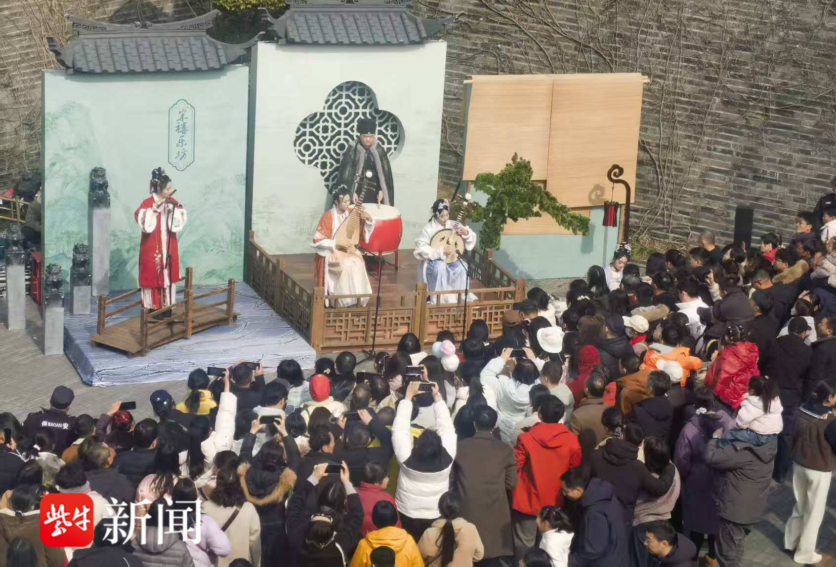 漫步宋夹城角角落落,仿佛步入千年宋韵时空。西门簪花汉服体验区成为热门打卡点,精美簪花造型装置前,游客驻足拍照、定格新春美好。不远处,自得琴社以《千里江山图》为幕,奏响《梅花三弄》等经典雅乐,箜篌、三弦婉转和鸣,为热闹假日增添一抹清雅诗意。“李白”“财神”“七仙女” 等NPC巡游互动,将园区变成沉浸式宋风剧场,游客们争相与“古人”合影互动,现场欢呼声不断。
