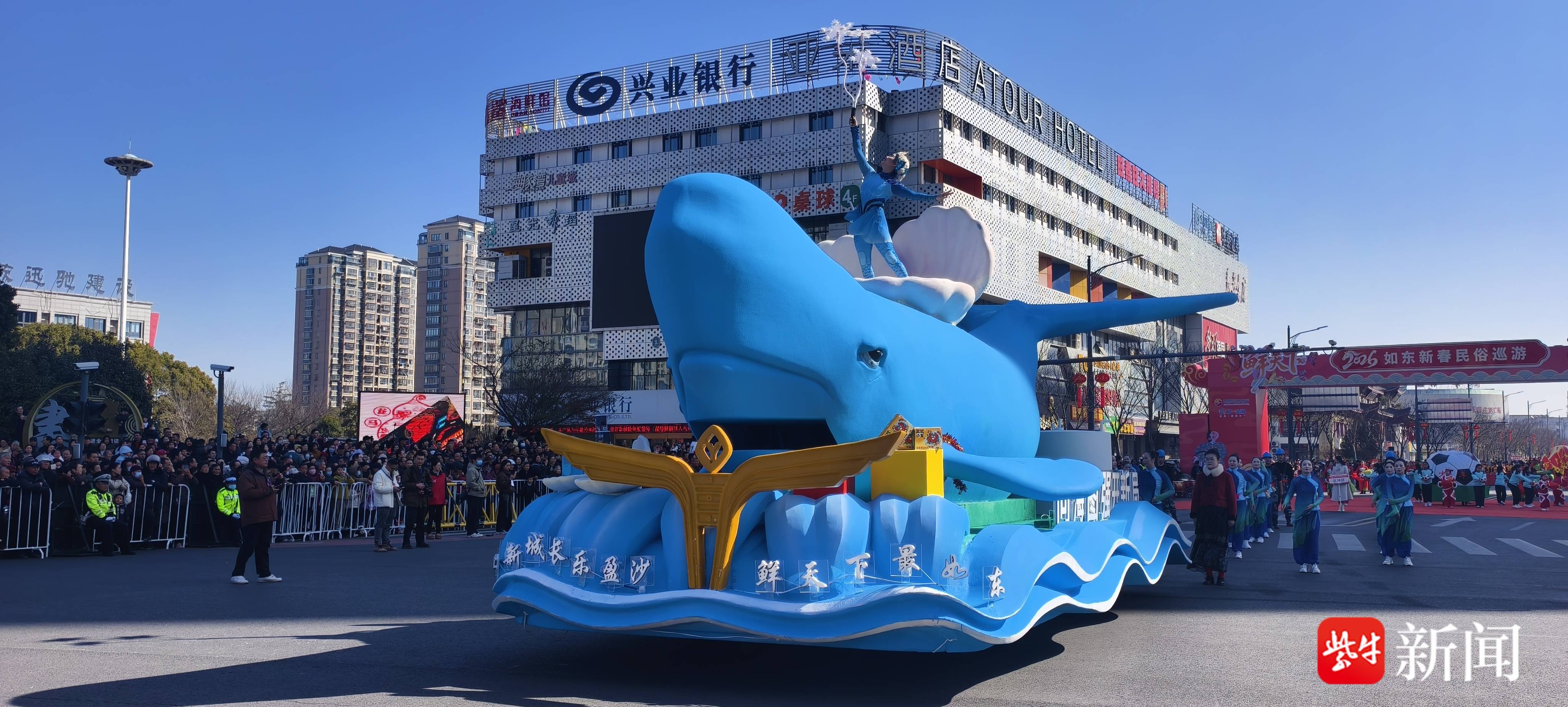 由全县16个镇(区、街道)组成的地方方阵,更是各具特色、亮点纷呈。栟茶古镇的浒澪花鼓轻盈灵动,尽显江南水乡的温婉韵味;岔河的足球少年方阵朝气蓬勃,展现着如东青少年的活力风采;丰利的荡旱船妙趣横生,充满浓郁的乡土气息。除此之外,舞龙、机器人、卡通形象、财神送福、空竹等新潮与传统元素巧妙融合,长沙镇海洋主题花车、文化馆主题花车缓缓穿行,将抹香鲸等地域特色符号融入其中,生动展现了如东乡村振兴、文旅融合的发展新貌。整场巡游采用行进与定点表演相结合的形式,传统民俗与现代创意碰撞交融,引得沿街市民阵阵喝彩、拍照不停。