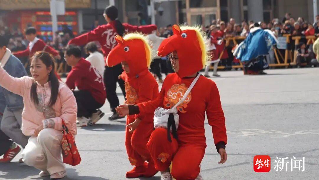 队伍一路向前,从人民公园到利群时代,再到文峰大世界,欢乐像接力棒一样传递。安塞腰鼓的鼓手们红绸翻飞、鼓点如雷,将陕北黄土地儿女的豪迈与江海大地的热情相融;“虾兵蟹将”踩着渔歌的节拍,摇头晃脑地走过,逗得孩子们咯咯直笑;骑手们奋勇争先,英姿飒爽,仿佛要把新年的希望一路带到远方。