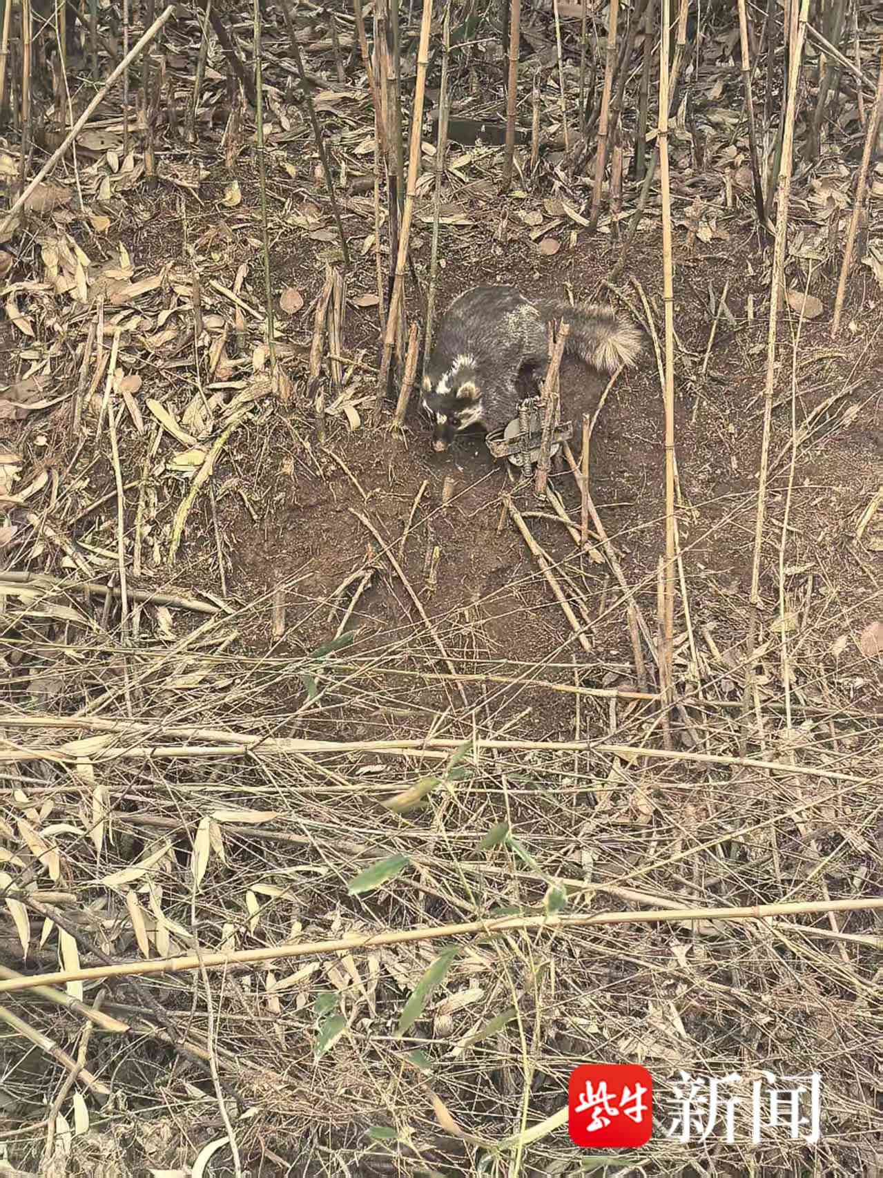 扬子晚报网2月23日讯(记者 万凌云 姜天圣)2月18日,大年初二。 下午2时许,在句容茅山北镇街村娘舅孙腊根家拜年的驻镇央企二航三公司职工万金贵,酒后和老表孙卫兵到附近的茅山脚下闲逛醒酒。不想,二人竟在山脚下的水杉林中,发现了一只被狩猎铁夹困住的果子狸!他及时给扬子晚报/紫牛新闻记者爆料并报警,最终成功解救出这只国家二级保护动物果子狸。